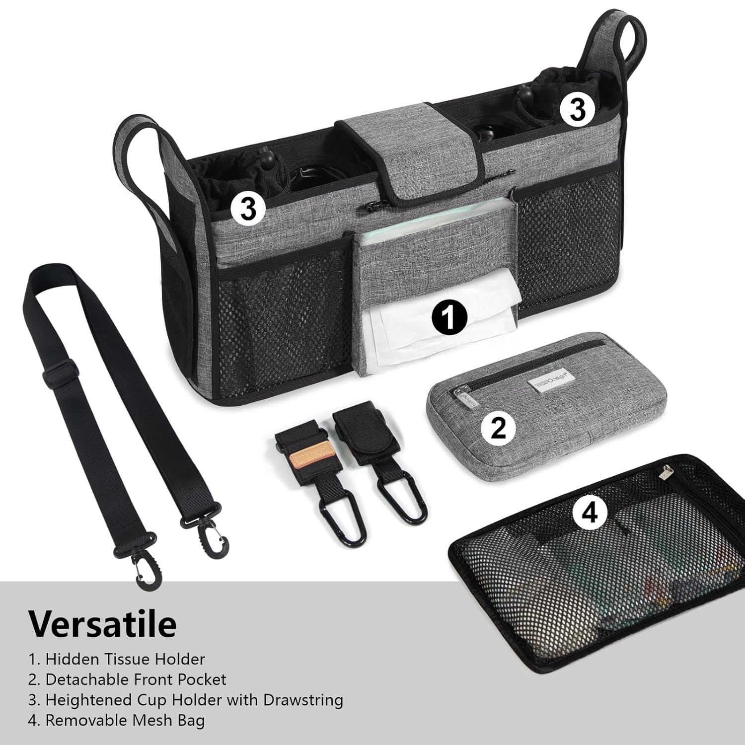 - TOP DESIGN & DURABILITY: The front detachable pouch can be used as a separate wristlet purse for phone, lipsticks and other small items. And the stroller caddy comes with a strap that allows you to wear it as a shoulder bag when carrying the baby for a walk. The thicker waterproof oxford material we choose makes the bag last longer.