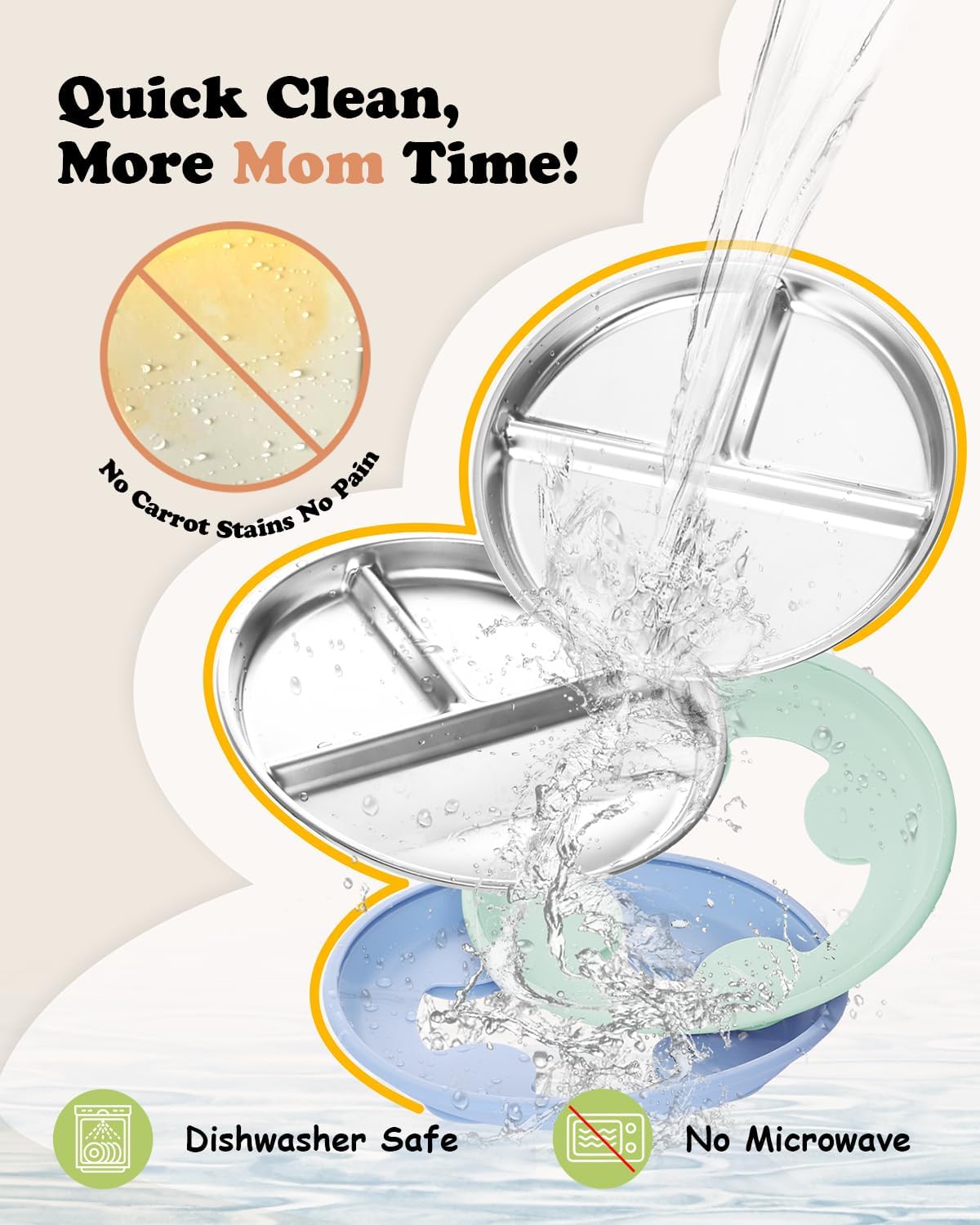 - Hassle-Free Cleaning: Saves 7.3 mins per meal in cleanup time! Resistant to food stains like carrots, the smooth stainless steel surface is easy to clean. The toddler plate are dishwasher-safe and, making cleanup quick and stress-free for busy parents. The dinner plate is suitable for reheating food in the oven. But metal plates are not recommended for microwave