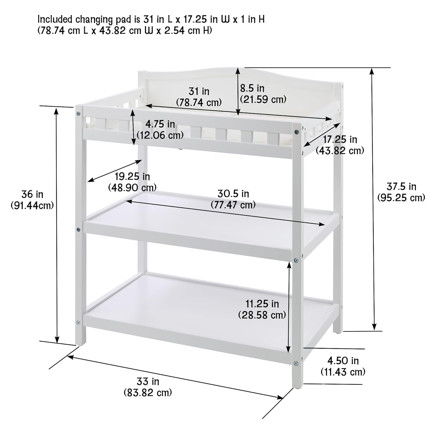 - COMPACT CHANGING STATION WITH STORAGE- A space-saving solution for parents who want style, storage, and function in one nursery essential. Table: 33" L x 19.25" W x 37" H. Pad: 31" x 17.25" x 1". Shelves: 30.5" L x 17.25" W x 11.25" H.