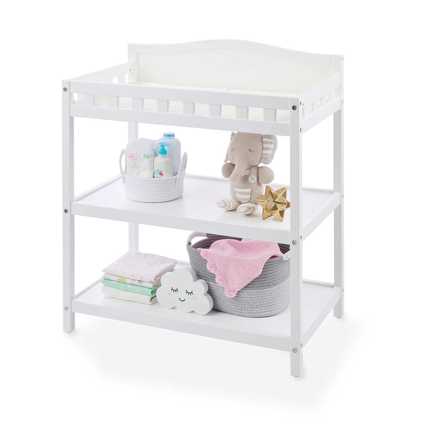 - STORAGE FOR DIAPERS & BABY ESSENTIALS - Two wide shelves hold everything from diapers to lotions, wipes, and towels. This baby changing station helps keep your nursery organized and clutter-free.