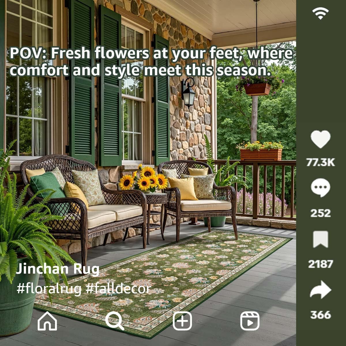 jinchan 3x8 Floral Runner Rug for Hallway Washable Kitchen Runner Vintage Romance Design Non Slip Thin Indoor Floor Cover Low-Profile Throw Carpet for Entryway Bathroom Bedroom Porch, Green