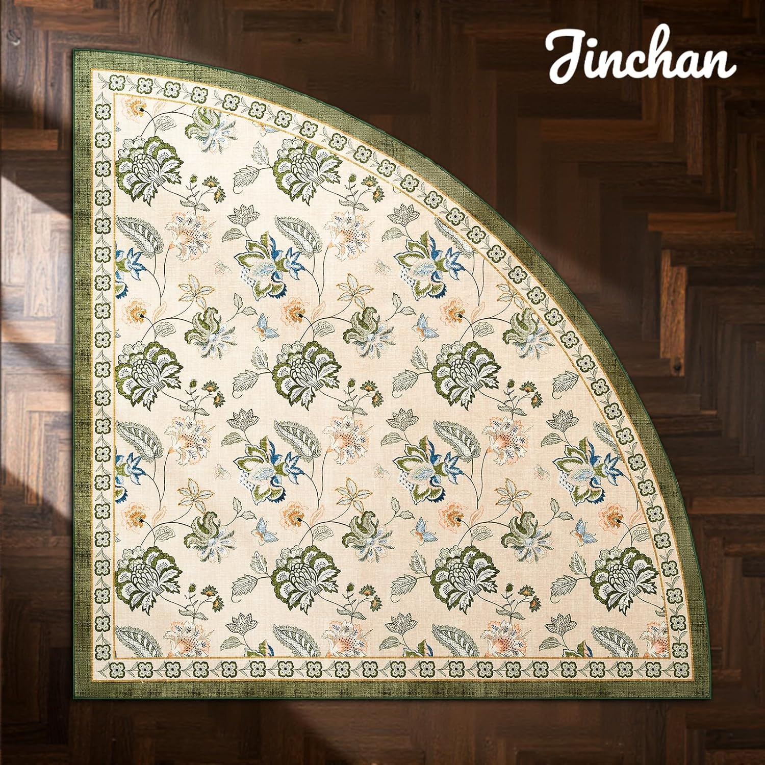 jinchan Floral Corner Rug for Living Room Washable Bedroom Rug Vintage Romance Design Non Slip Quarter Circle Lightweight Low-Pile Throw Carpet for Reading Nook Playroom,6ft Radius, Green/Beige