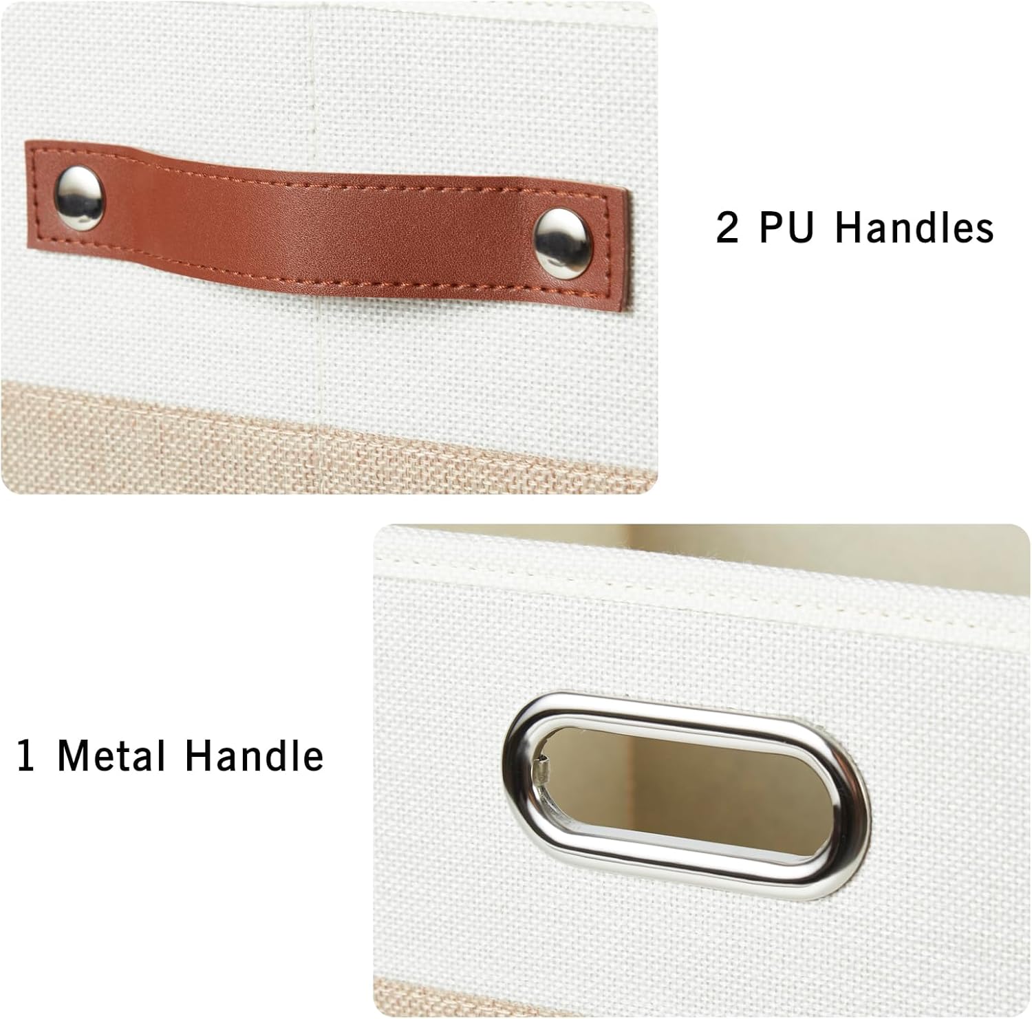 Large Collapsible Fabric Storage Bins with 3 Handles, Foldable Organizer Baskets for Closet, Shelves, Living Room | 3 Pack, Durable PU & Metal Handles (17"x11.8"x11.8", Beige & White)