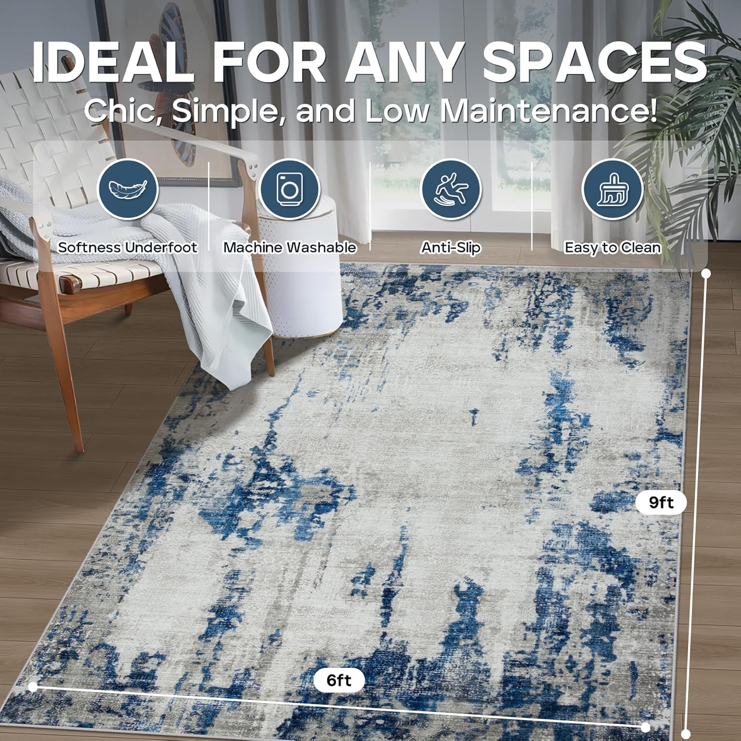 6x9 Area Rugs for Living Room Rug Washable: Modern Rug for Dining Room Bedroom Carpet Non Slip Low Pile 6 by 9 Indoor Abstract Nursery Home Office Blue White