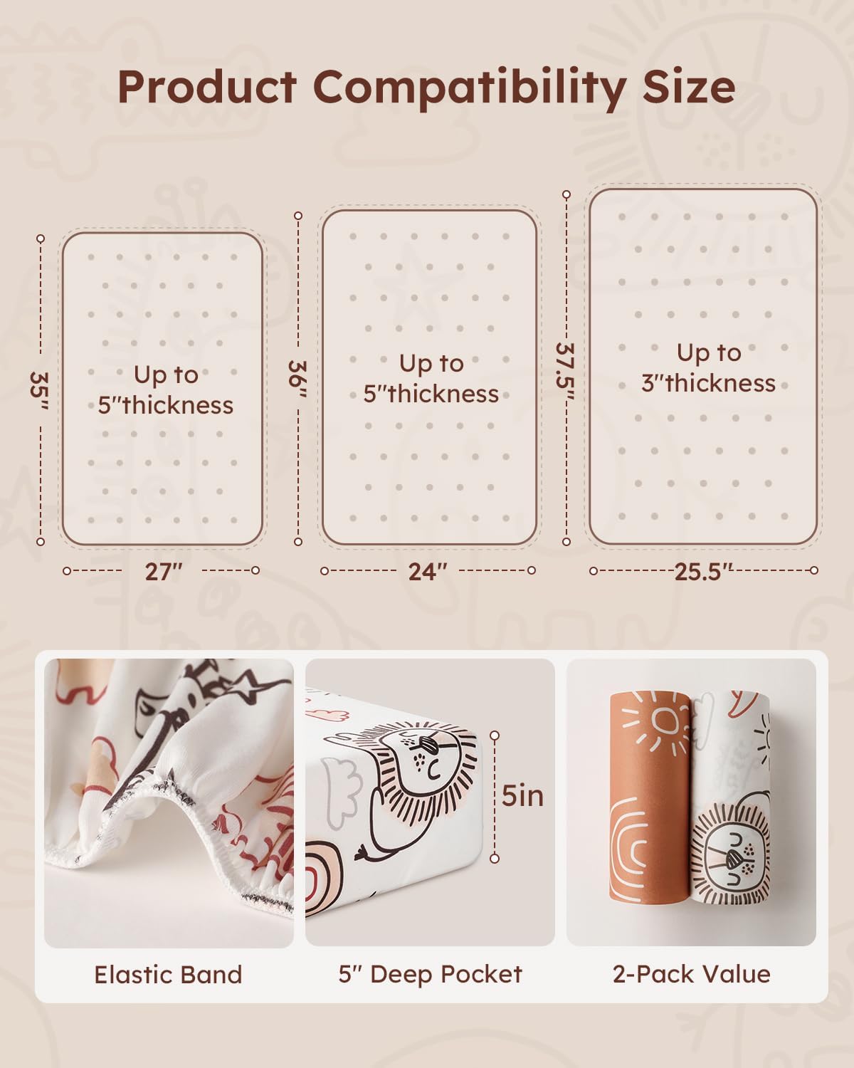 - Snug Fit and Secure: Measuring 38"x26", Yoofoss mini crib sheets are designed to snugly fit most Pack n Play or potable playard mattress.The 3–5 inch deep pocket provides full coverage that wraps around the mattress to keep the sheet neatly in place, ensuring a safe and comfortable sleep for your baby.