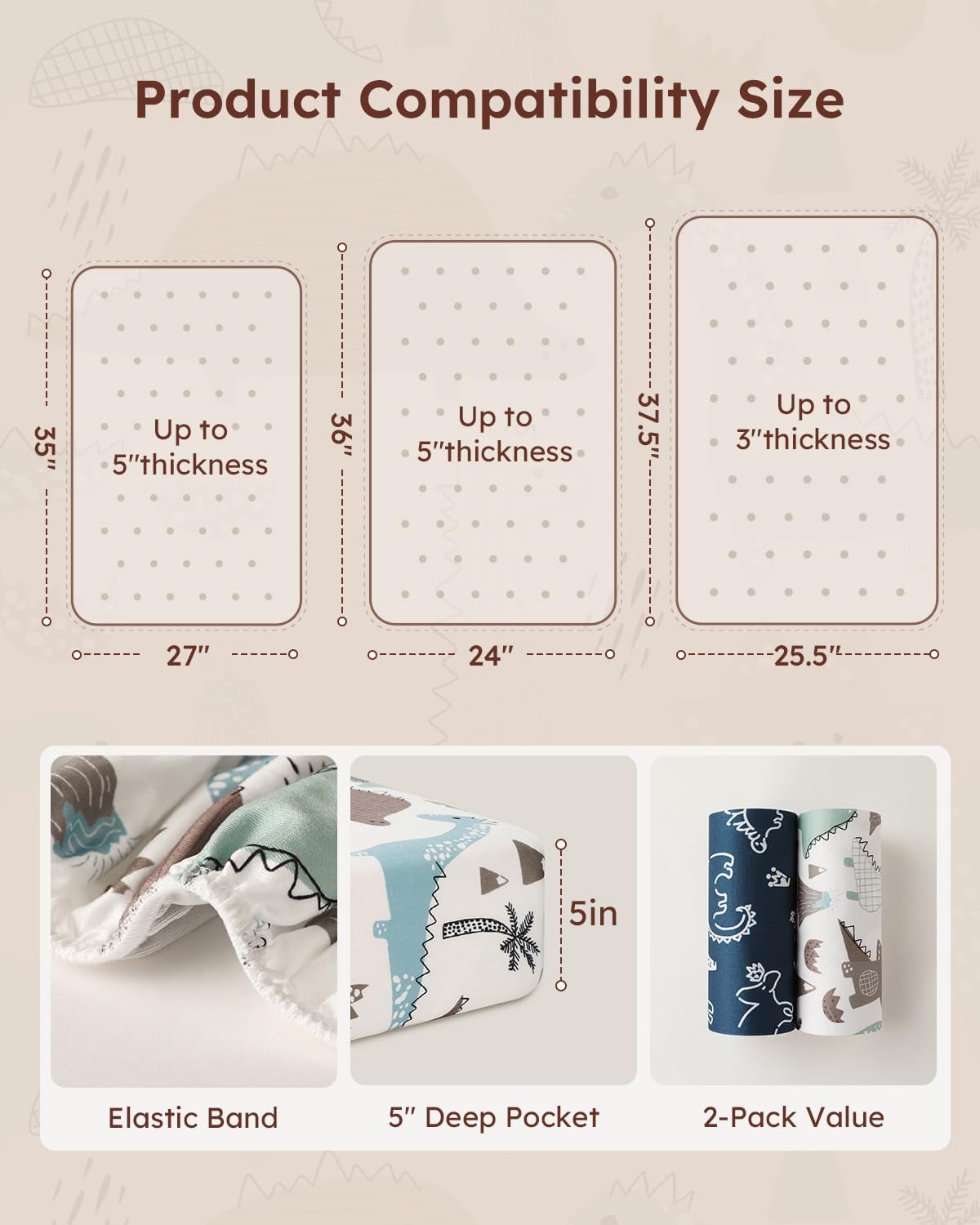 - Snug Fit and Secure: Measuring 38"x26", Yoofoss mini crib sheets are designed to snugly fit most Pack n Play or potable playard mattress.The 3–5 inch deep pocket provides full coverage that wraps around the mattress to keep the sheet neatly in place, ensuring a safe and comfortable sleep for your baby.