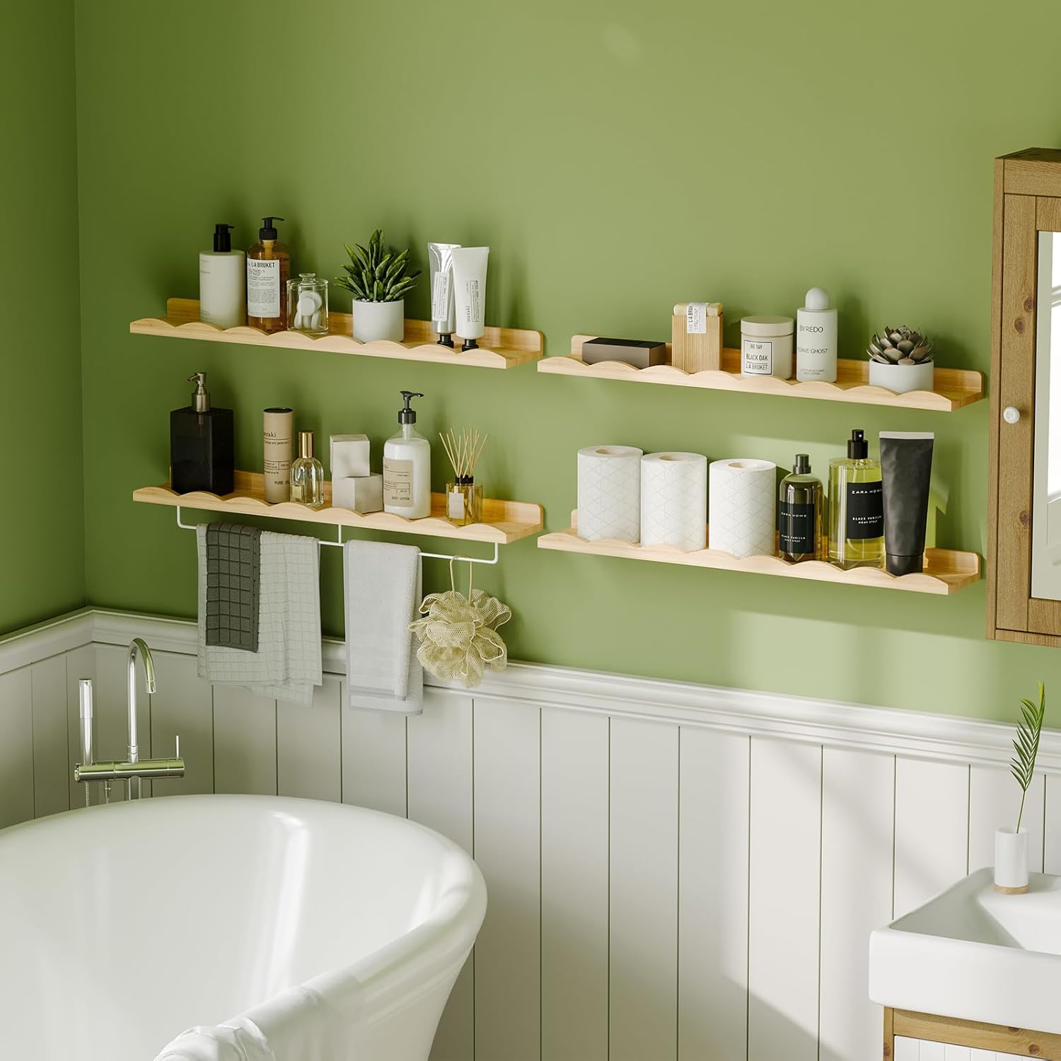 Fixwal Nursery Shelves, 24 Inch Floating Bookshelves for Wall Set of 4, Scalloped Wall Book Shelves with Towel Rack for Kids, Toddler Room, Baby Room, Nursery Decor and Storage(Natural Wood)