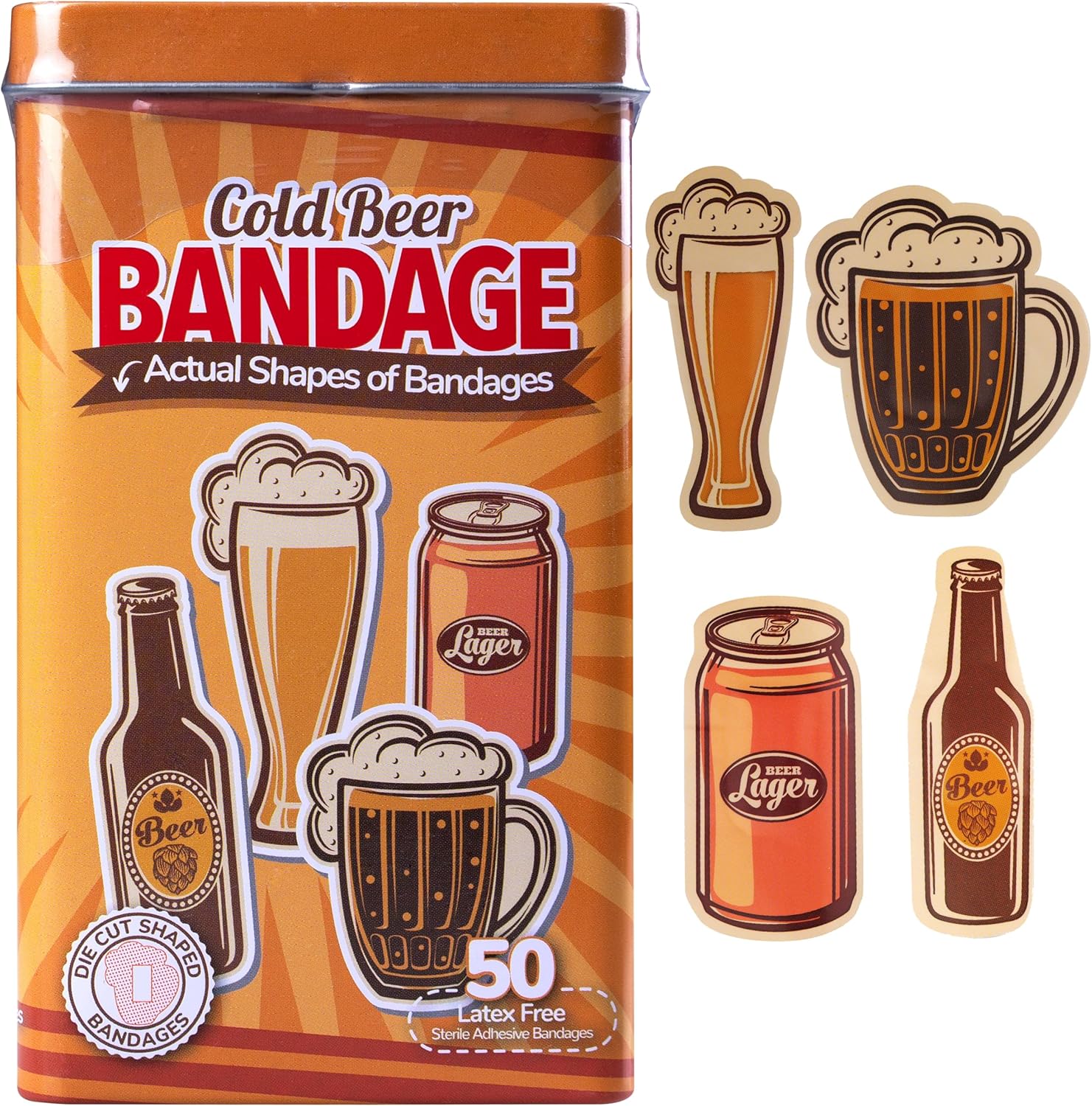 - COLD BEVERAGE BANDAGES: This 50 piece tin of Cold Beverage bandages feature 4 fun cold beverage shapes, and is sure to induce laughter and smiles while protecting wounds such as cuts, scrapes, and burns; sticky bandages come in a cute decorative cardboard box which makes for an excellent novelty gag gift or stocking stuffer for adults
