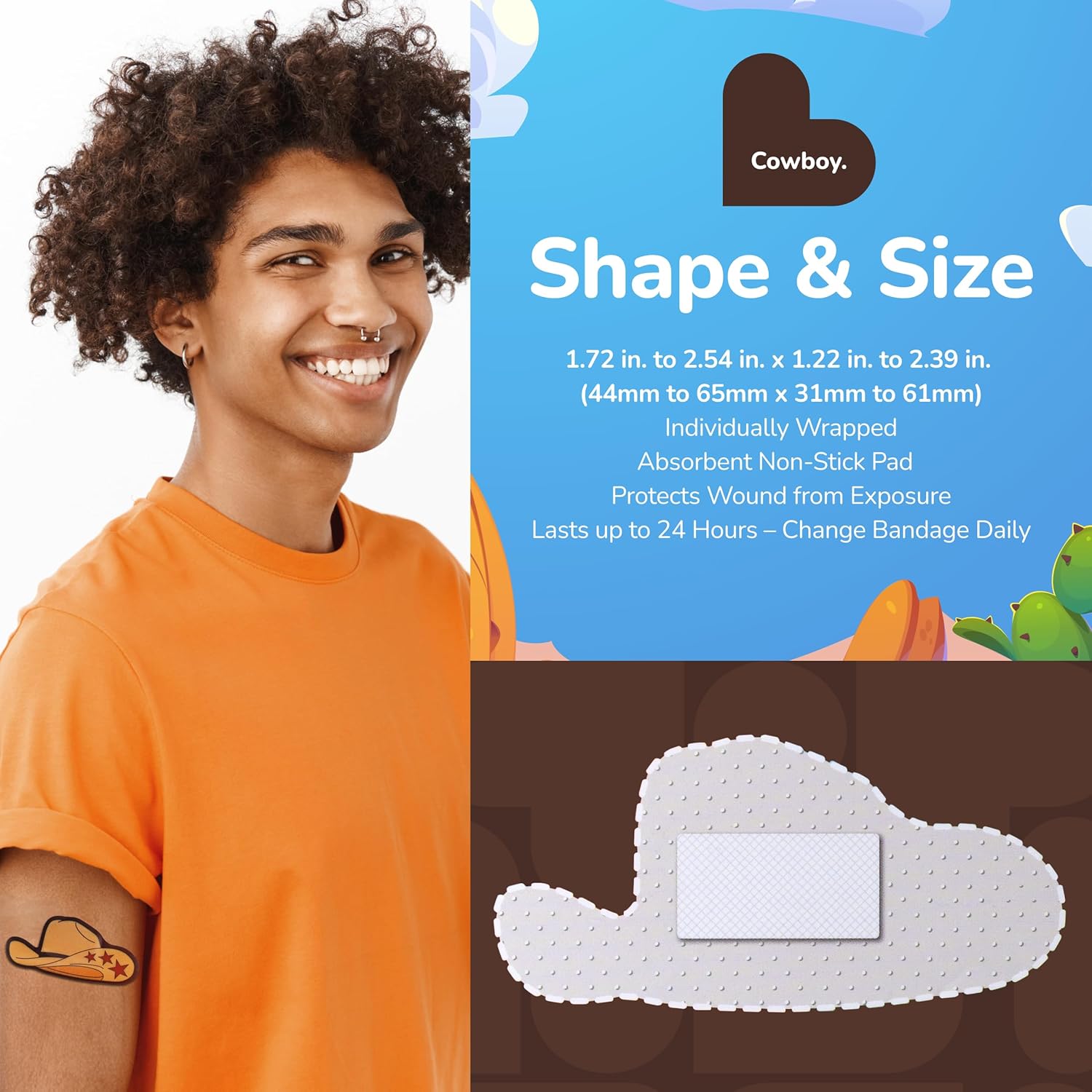 - COWBOY BANDAGES: This 50 piece tin of Cowboy shaped bandages features fun cowboy hat, horseshoe, cactus, and cowboy boot shapes, and is great for putting a smile on kids' faces while protecting wounds such as cuts, scrapes, and burns; sticky bandages come in a cute tin and are perfect for kids and adults alike, and also for school nurses and pediatric doctors