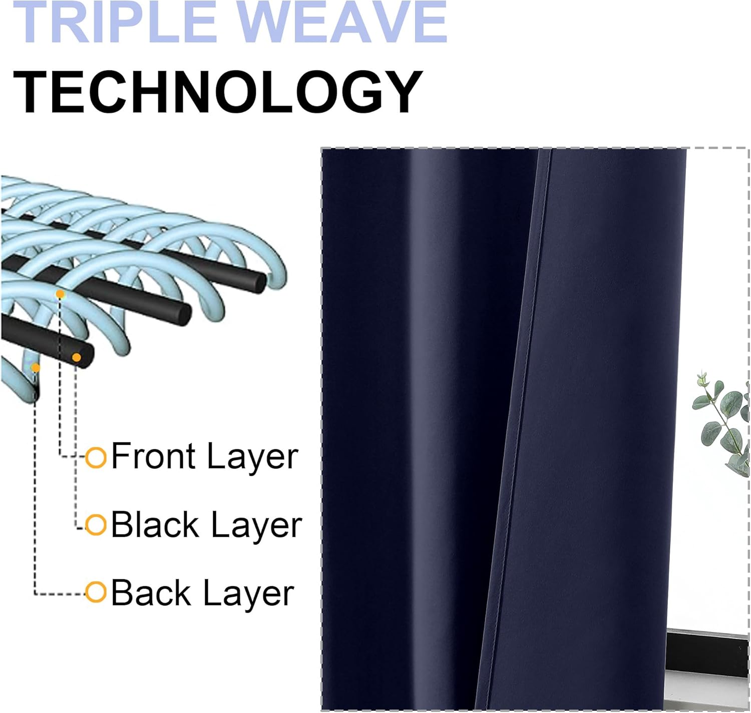- High-Quality Materials: Crafted from high-quality polyester fiber, guarantee both stiffness and drape. This soft yet durable light-blocking fabric boasts a three-layer weave, with a middle layer of black yarn acting as an effective light-blocking panel, effectively blocking light while providing privacy. The identical colors on both sides further enhance its aesthetic appeal, adding a touch of elegance to your home.
