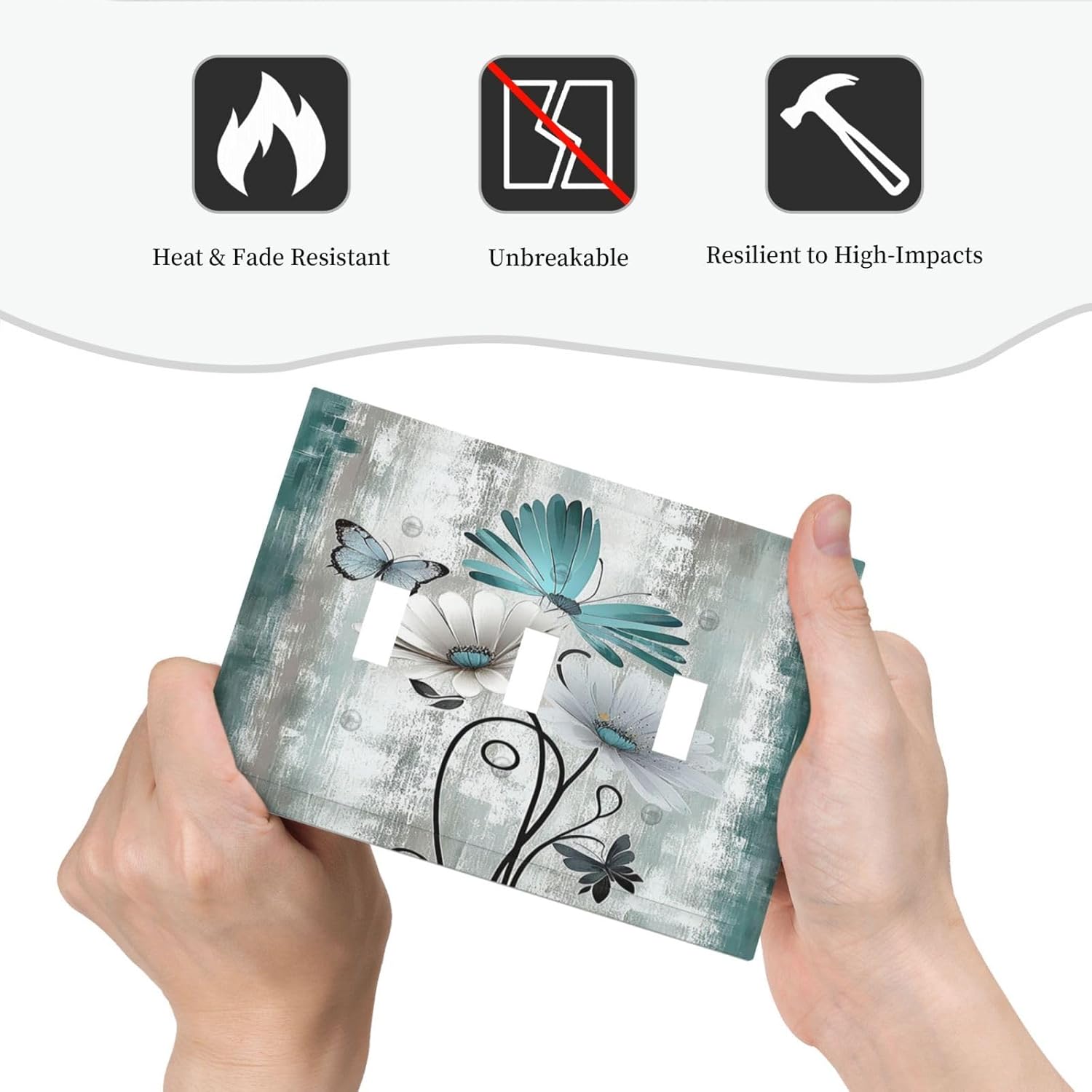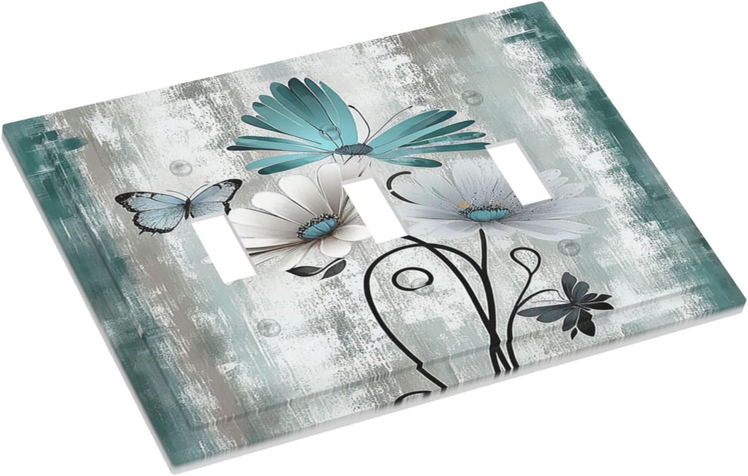 Decorative Switch Plates Rustic Teal Daisy Floral Flowers Butterfly Wood Grain 3 Gang Wall Plate Triple Toggle Light Switch Cover Faceplate Electrical Wall Panels for Bathroom Bedroom Decor