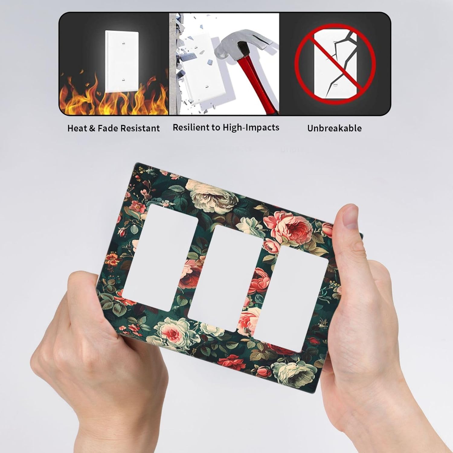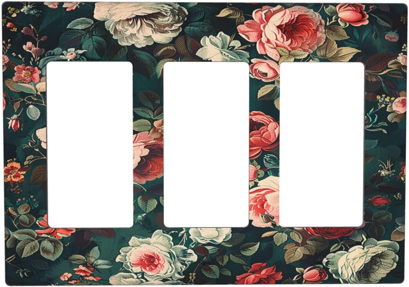 Light Switch Covers Baroque Vintage Peony Flower Floral 3 Gang Rocker Electrical GFCI Decorative Triple Outlet Wall Plate Cover Switchplate for Bedroom Farmhouse Decor