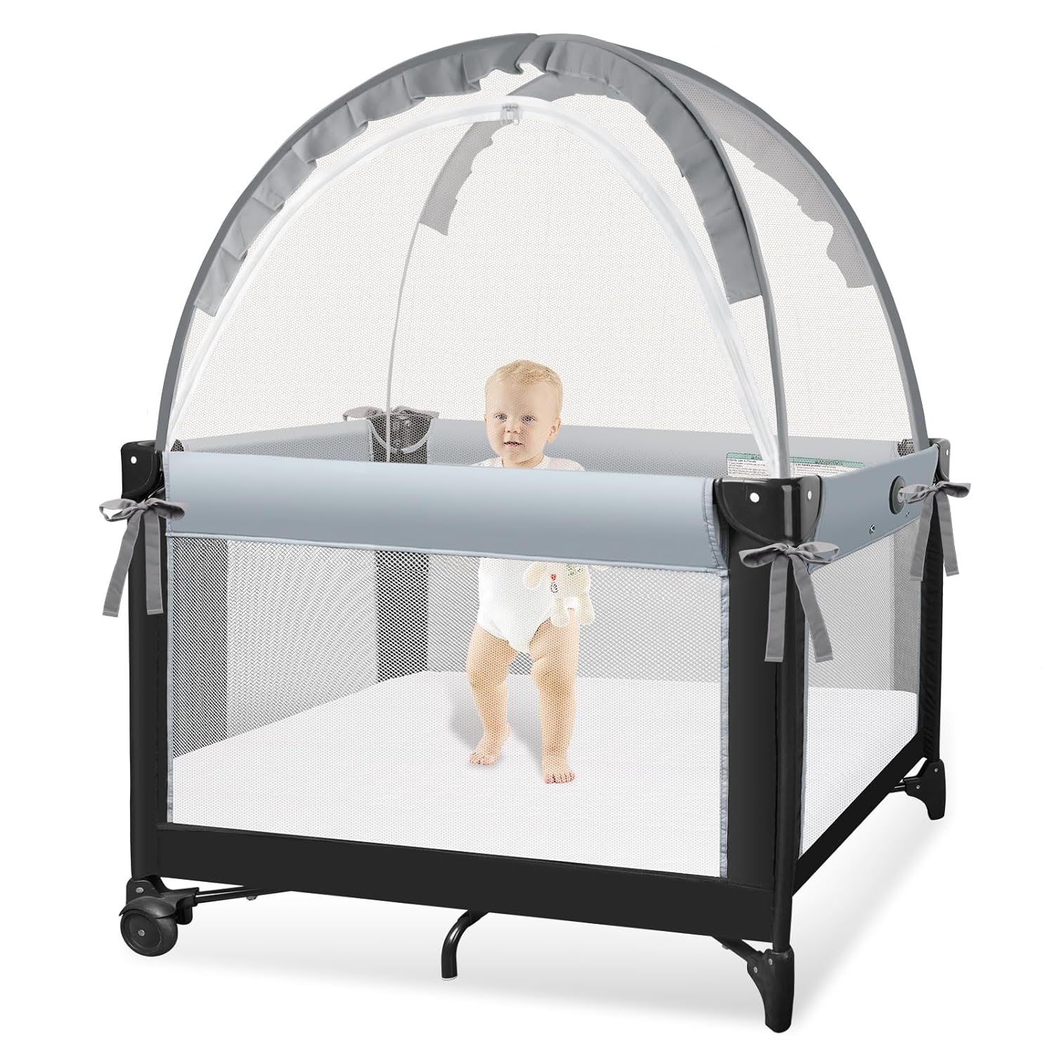 Pack N Play Tent - Mini Crib Tent to Keep Baby from Climbing Out - Crib Net to Keep Baby in - Pop Up Breathable Cribs Cover - Canopy with Upgrade Strong Mesh and Durable Zipper (Gray, Small)
