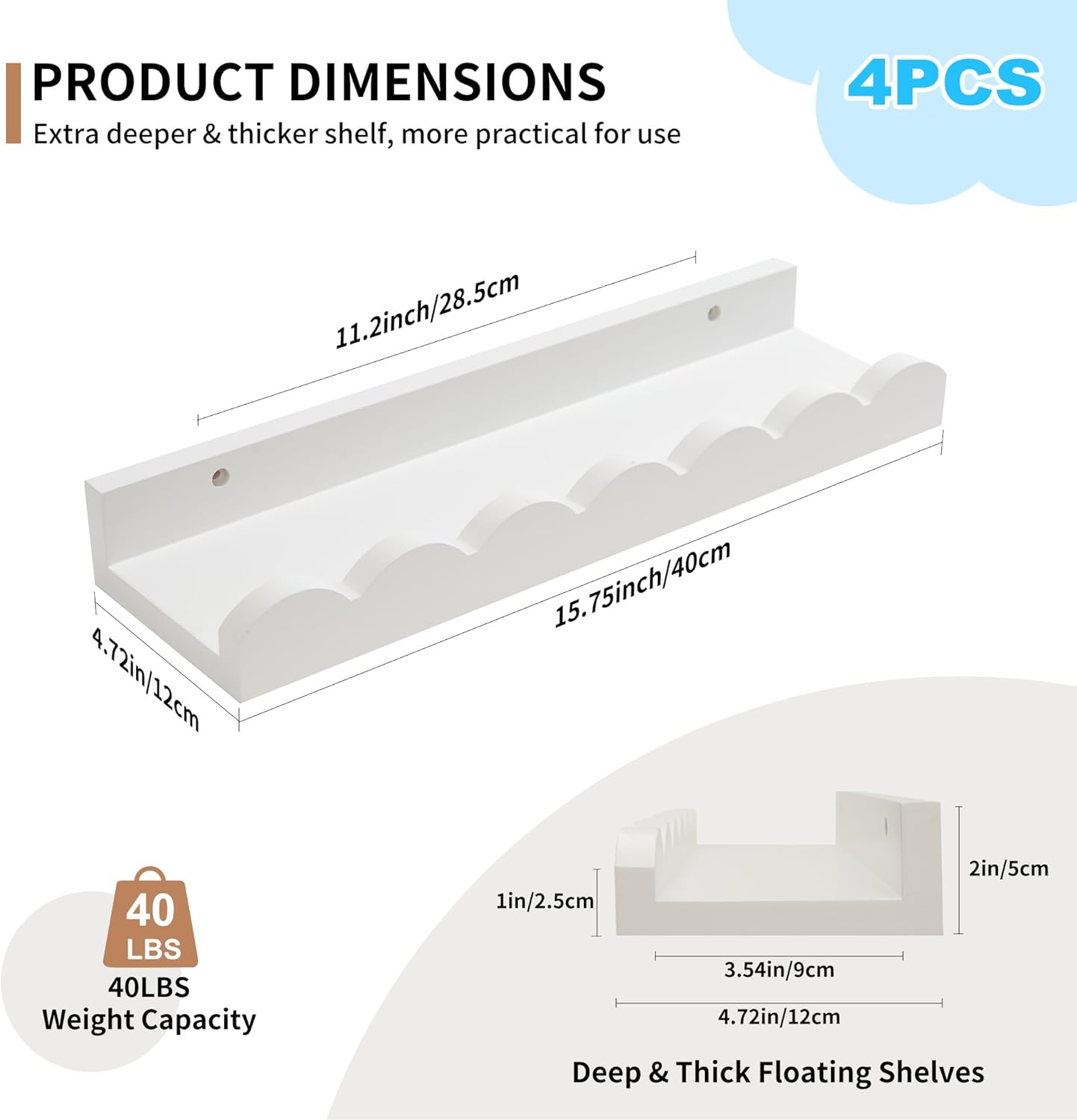 Scalloped Baby Book Shelf,Floating Shelves for Wall Set of 4 Solid Pine Wood Nursery Bookshelves with Wave Lip for Bedroom Kids, Toddler Room, Baby Room, Nursery Decor(White,40cm)