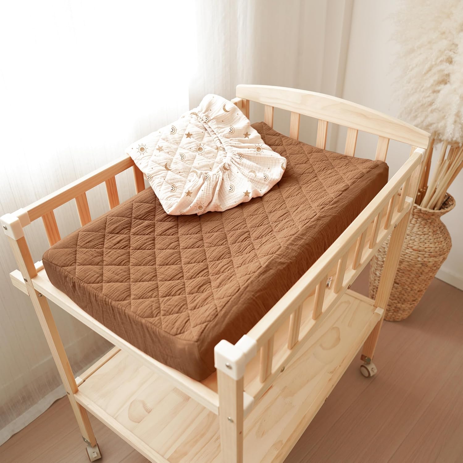 - Quilted and Soft Fabric: Our changing pad cover consists of three layers: the top layer is made of 100% cotton (muslin), which is soft and absorbent; the middle layer is quilted with soft padding to ensure coziness and comfort; and the bottom layer is made of 100% waterproof polyester to protect the pad from wetting. Our unique design provides a comfortable touch for your baby while ensuring waterproof functionality, making our changing pad soft and perfect for delicate baby skin.