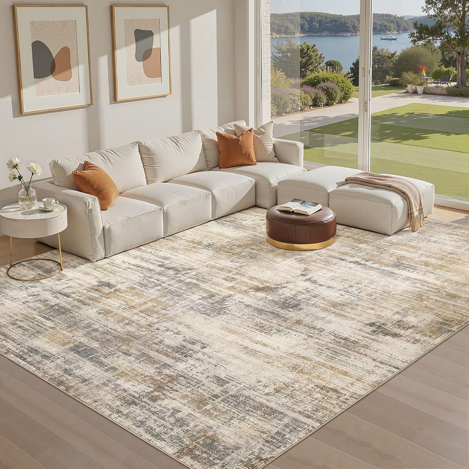 Area Rug for Living Room: 12x15 Washable Neutral Abstract Modern Soft Rugs Non Slip Indoor Floor Stain Resistant Large Carpet for Bedroom Dining Room Office Nursery - Golden Brown