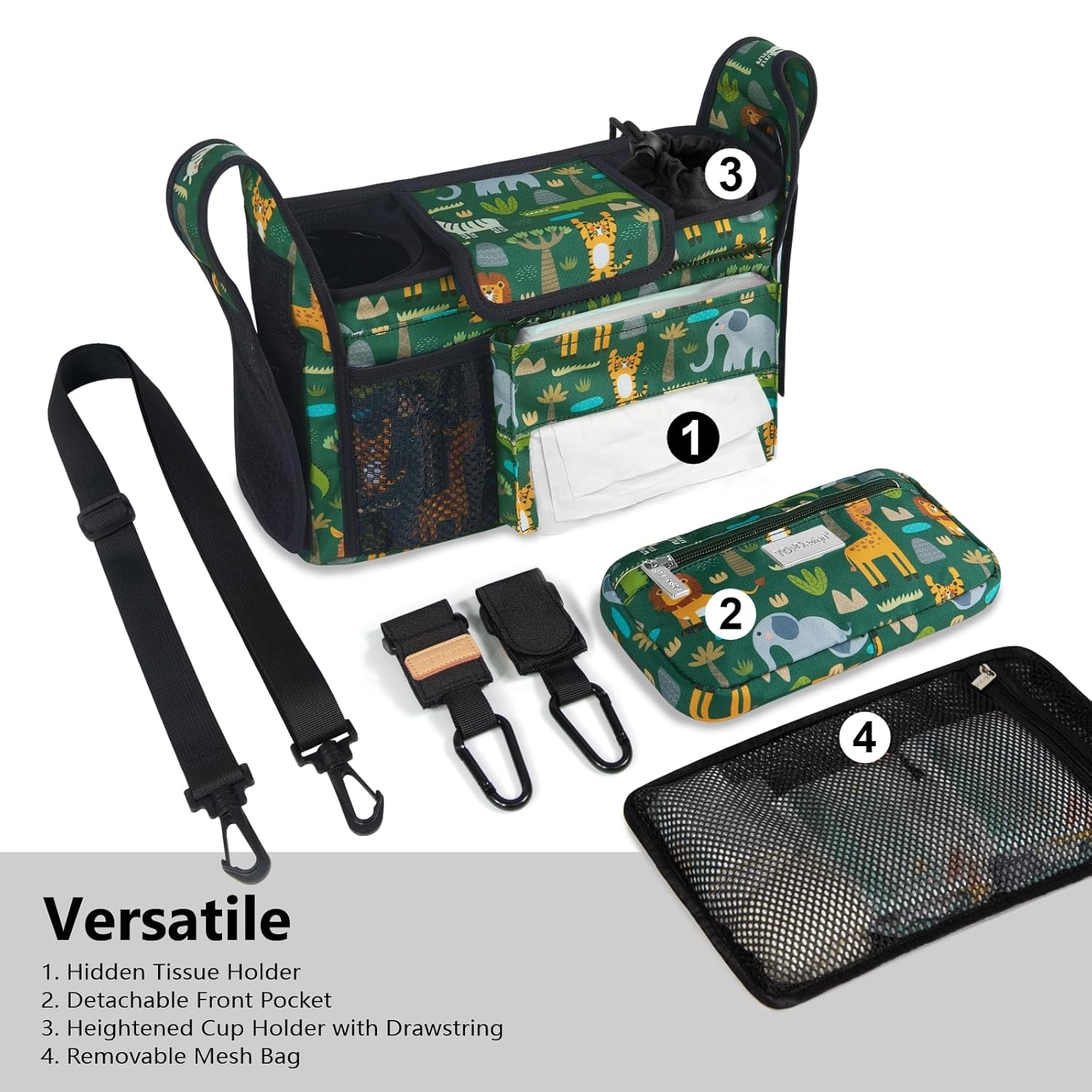 TOPDesign Universal Baby Stroller Organizer, Stroller Caddy with Detachable Mesh Bag & Heightened Insulated Cup Holders & Non-Slip Secure Hooks Accessories, Fits Most Strollers (Zoo 2)