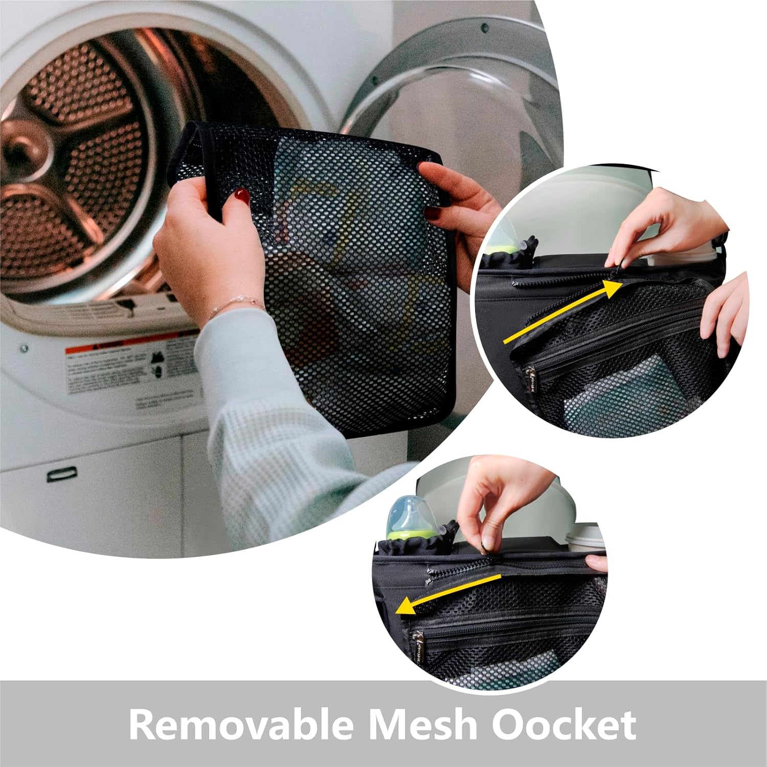- UPGRADED VERSION WITH DETACHABLE MESH BAG: A mesh laundry bag is added for extra storage to stash baby's change clothes or diapers. It's detachable and can be put directly into the washing machine. Multi-functional partition design of our stroller organizer helps you keep all baby essentials organized and within reach. 2 insulated cup holders for your baby bottle, water bottles or coffee cup. The hidden wipe dispenser allows you to quickly grab wipes.