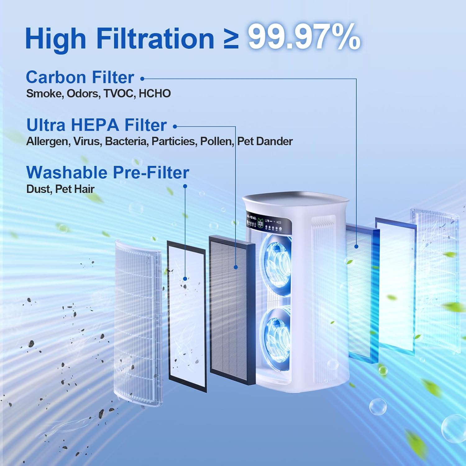 - Designed For Big Houses: SOLEUSAIR air purifier features a patented dual-circulation fan system that increases purification efficiency by 108.19% compared to single-fan models. With a maximum coverage of 4,000 sq. ft., it’s ideal for large spaces like schools, hospitals, bedroom, hotels, offices, and spacious living areas.It purifies a 4,000 sq. ft. home in just 1 hour.