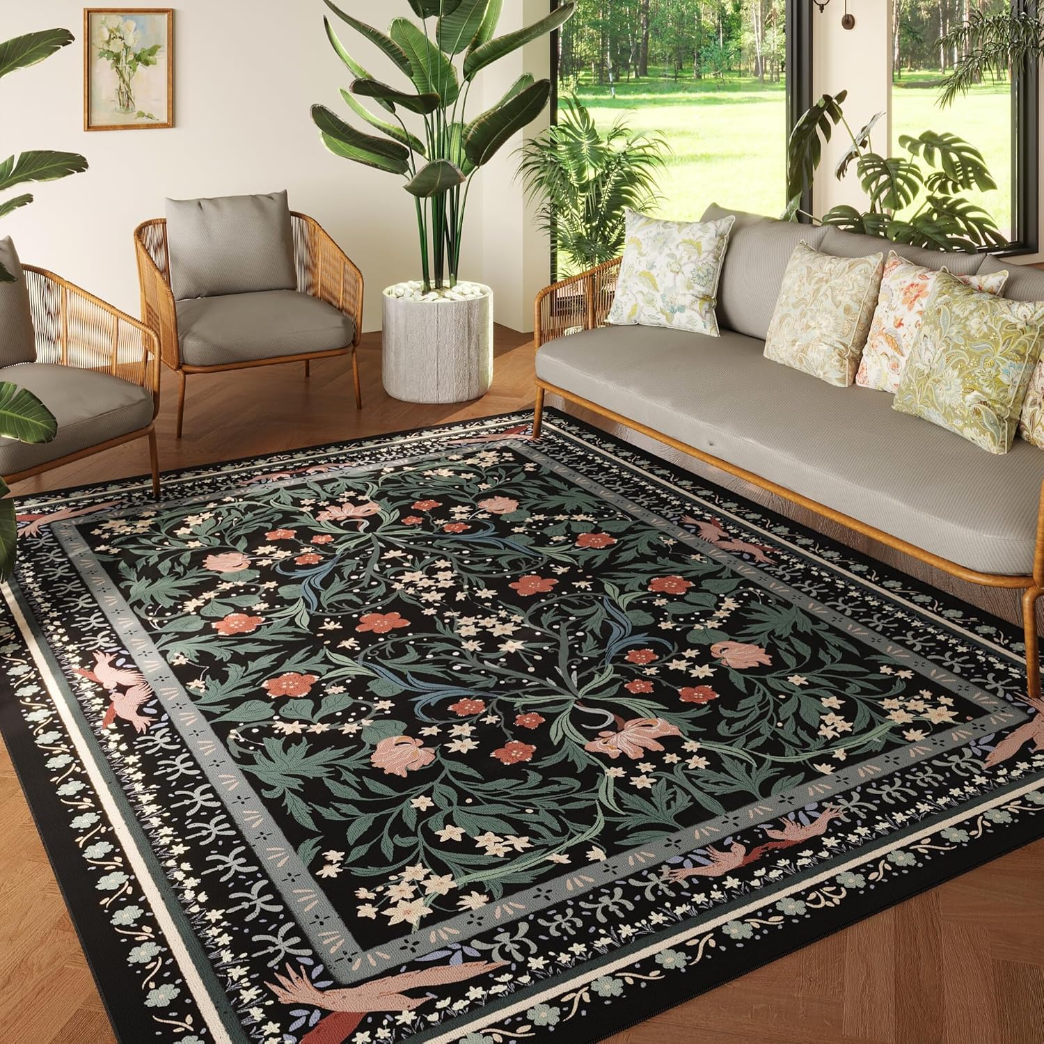 5x7 Washable Rug Vintage Floral Botanical Area Rug Non Slip Low Pile Large Rugs for Living Room, Bedroom, Farmhouse, Dining Room, Kids Playroom, Black