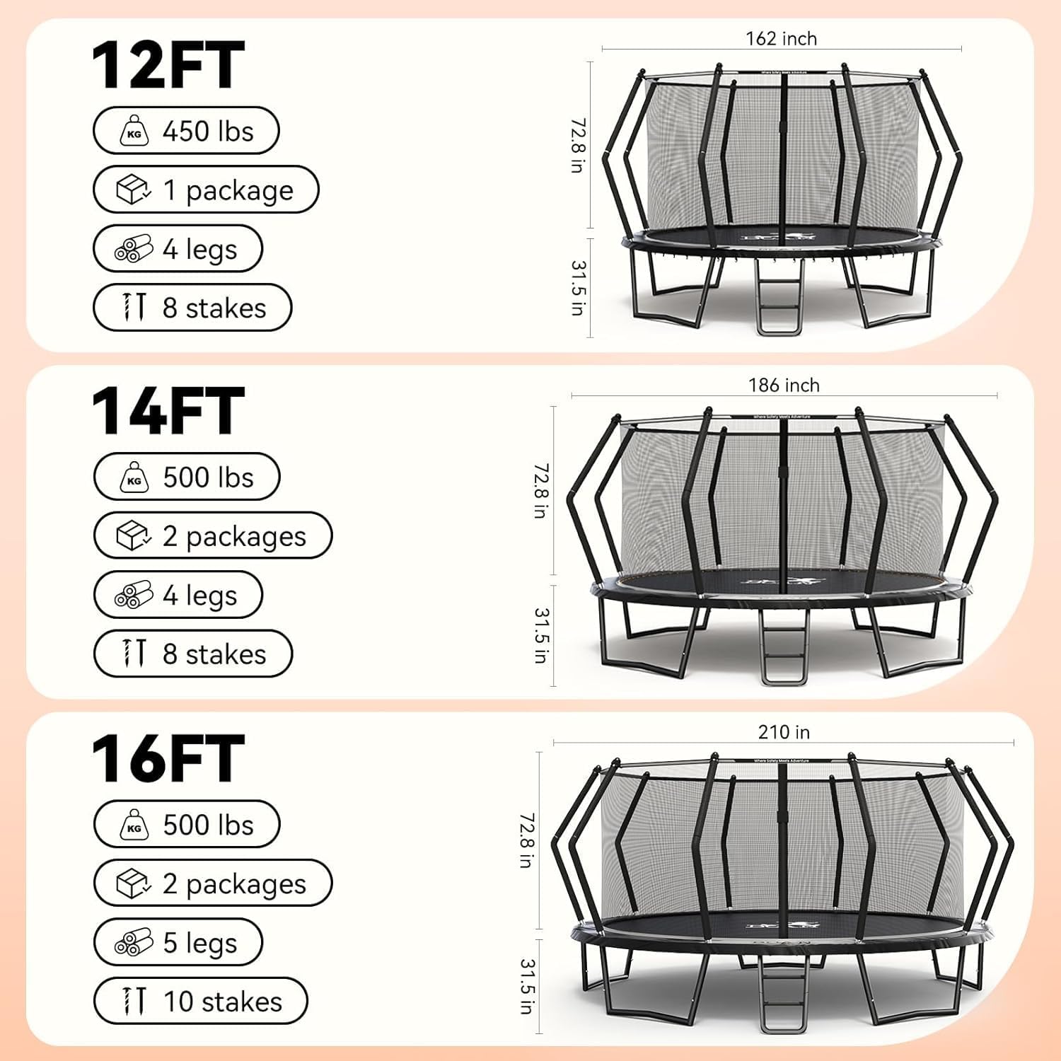 - Let kid play with confidence - Safety First - With CURVED POLES, your trampoline has MORE SPACE between kid and the poles for wild bouncing fun. The black OCTAGON BASE makes trampolines more STABLE for many kid to play together and make wonderful memories. Uncompromising safety!(ASTM F381-16 Standard)
