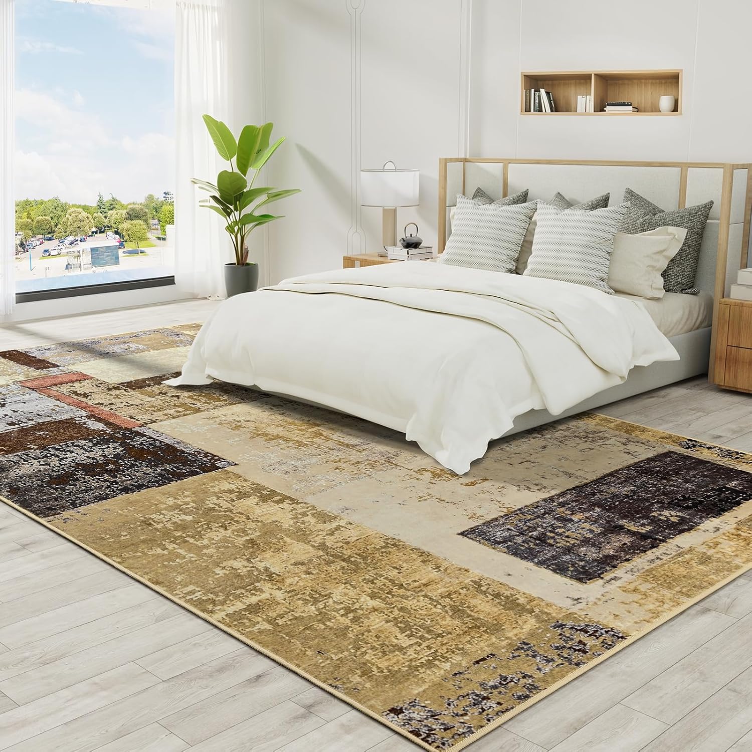 LOCHAS Rug for Living Room, Washable Soft Area Rugs for Bedroom 6x9, Abstract Carpet for Indoor Office Kids Dining Room Nursery Floor, Khaki Geometric Vintage Home Decor, Non Slip, Pet Child Friendly