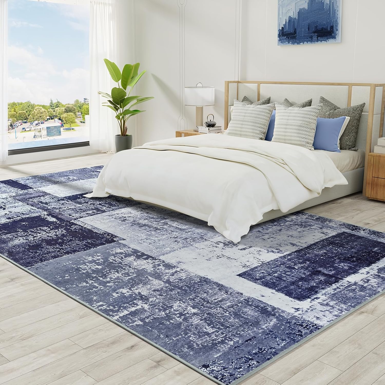 LOCHAS Rug for Living Room, Washable Soft Area Rugs for Bedroom 8x10, Abstract Carpet for Indoor Office Kids Dining Room Nursery Floor, Blue Geometric Vintage Home Decor, Non Slip, Pet Child Friendly