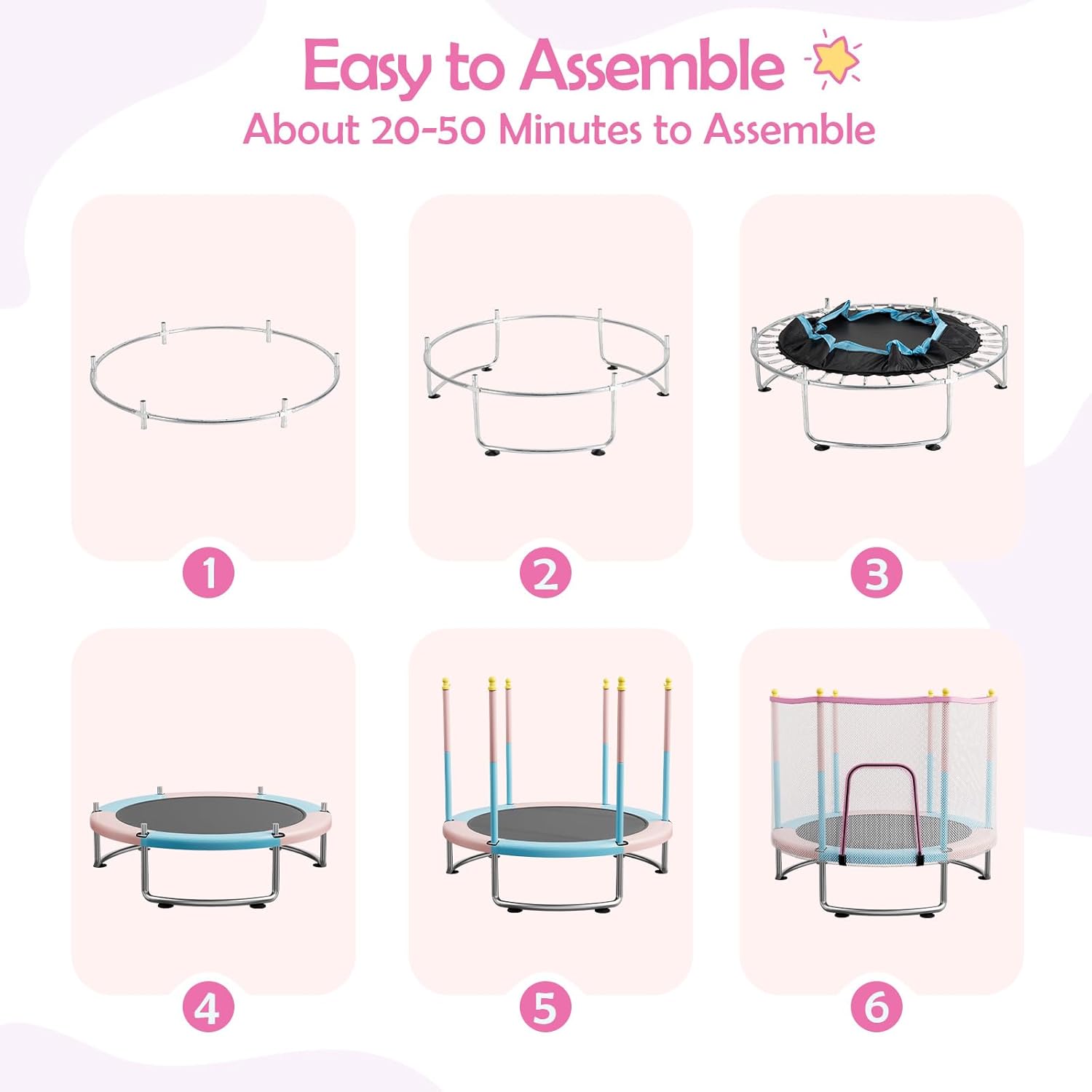- 【Quick & Tool-Free Assembly】Set up your toddler trampoline in just 6 simple steps—no extra tools required! Clear instructions make assembly quick and stress-free, so your kids can start jumping in minutes. Missing parts? Contact us and we’ll resolve it within 24 hours.