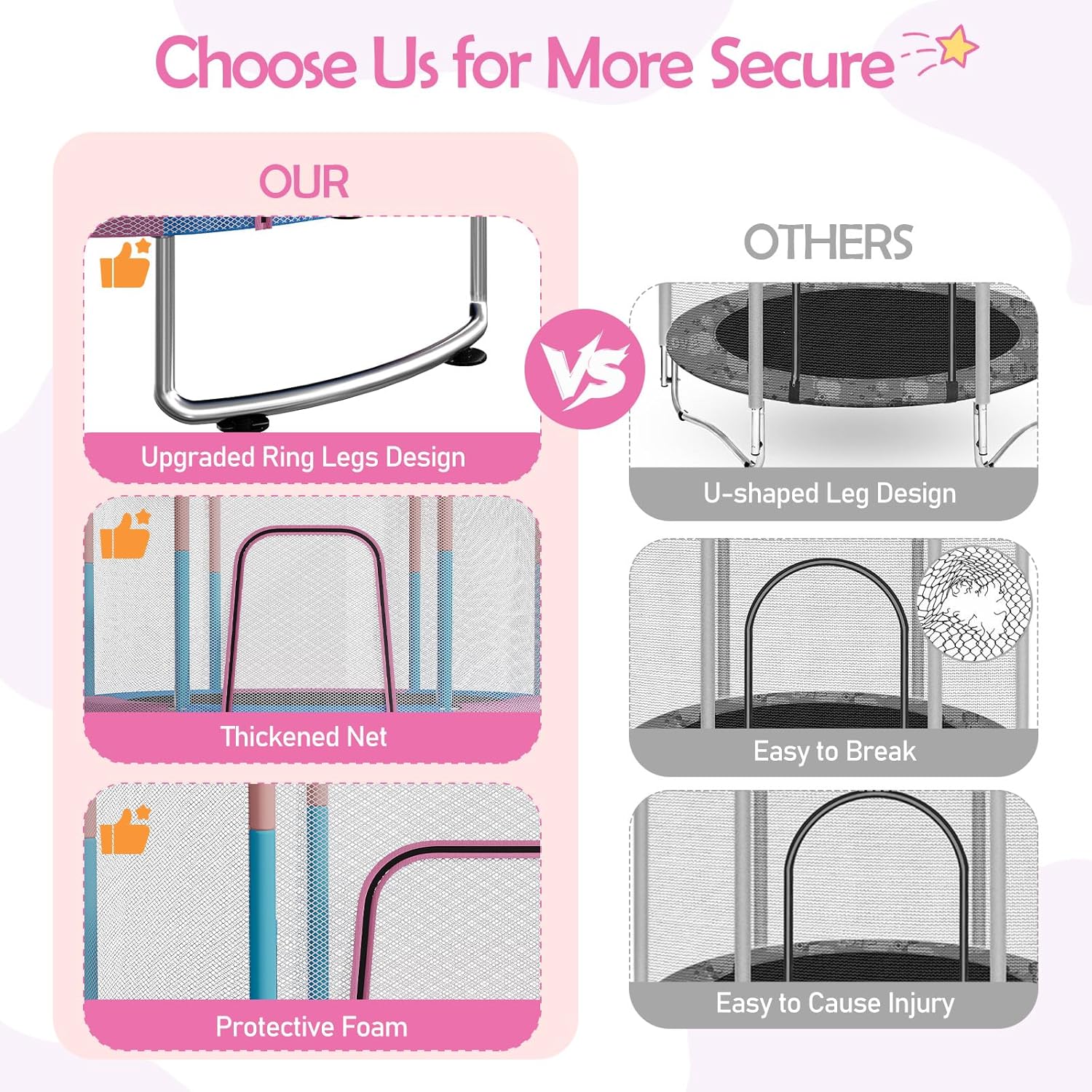 - 【Sturdy, Shock-Absorbing Structure】Built with a square-insert alloy steel frame, this 4.5FT/5FT trampoline provides maximum stability and support. Rust- and corrosion-resistant, with U-shaped legs and anti-slip pads that reduce noise, absorb shock, and protect floors. Safety tested and supports up to 440 lbs.