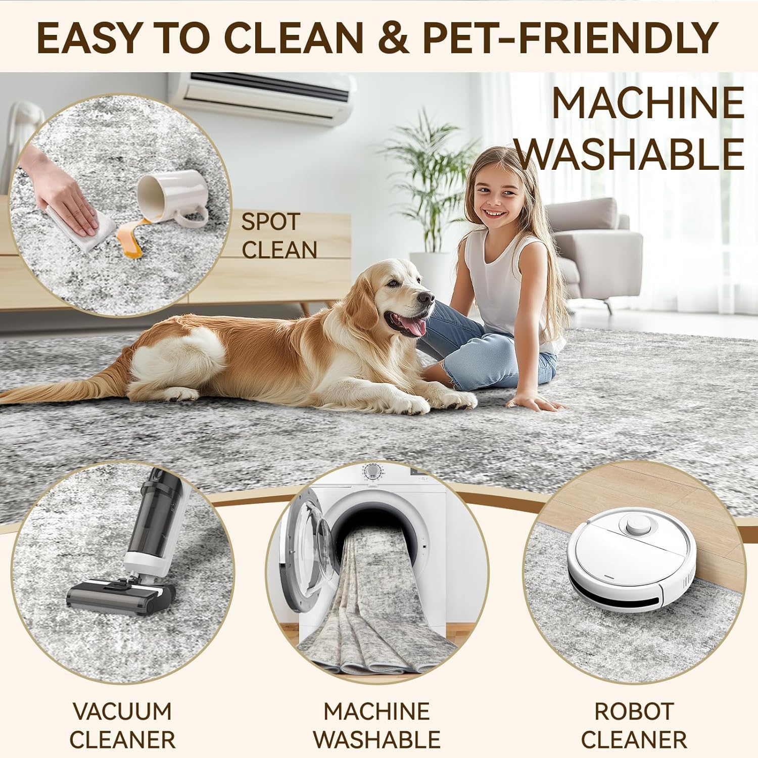 - Tides Series – Effortless style that flows with your life.This modern machine-washable non-slip rug features reinforced edges and a low-pile design that resists dirt. Its water-repellent surface makes spills easy to clean - liquids bead up for quick wiping. Simply machine wash in cold water (no bleach) to refresh. The non-slip backing keeps it securely in place. A perfect blend of function and contemporary design for active homes.
