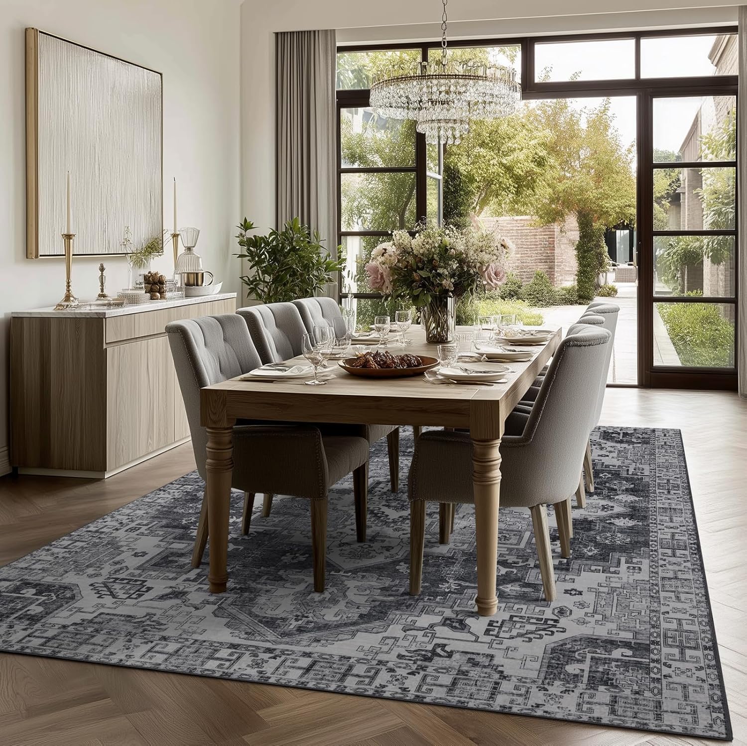 Washable Rugs 5x7 Area Rugs for Living Room, Thin Carpet for Bedroom, Soft Faux Wool Retro Dining Room Rug,Non Slip&Non-Shedding Resistant Low Pile Vintage Print Rug for Home Office (Medium Gray)