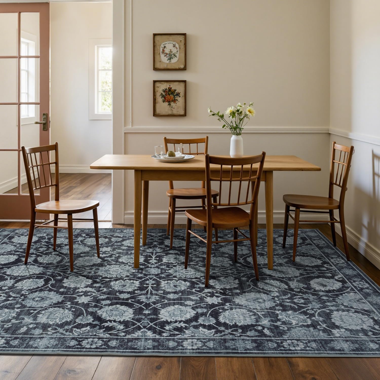 Area Rug 5x7 for Living Room & Bedroom, Large Washable Rugs, Soft & Non Slip, Vintage Carpet, Low Pile Wool Carpets for Indoor Under Table Dining Home Office Nursery Playroom, Black