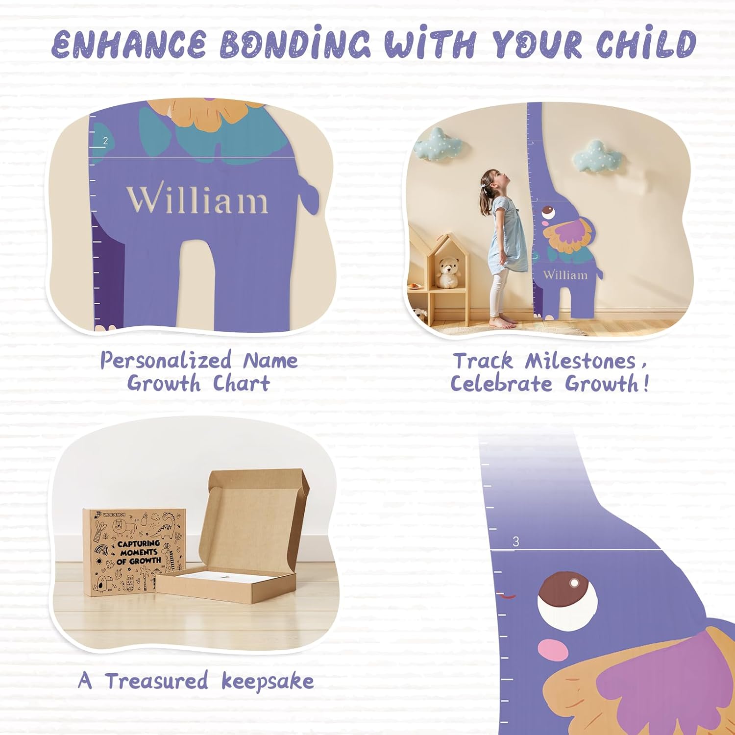 Personalized Name Growth Chart for Kids, Elephant Patchwork Wooden Height Chart for Wall Decor, Custom Height Ruler, Baby Boy Girl Measurement Ruler for Bedroom Playroom, Easy to Mark