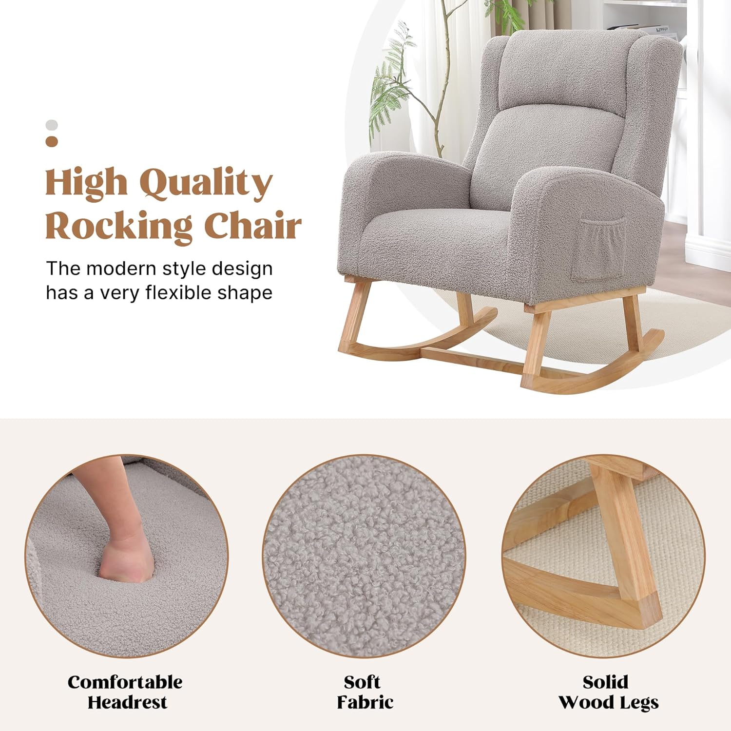 Rocking Chair Nursery, Nursing Rocking Chairs for Mom Nursery, Comfy Wingback Glider Rocking Armchair with Side Pocket for Nursery Living Room Bedroom, Teddy Light Grey