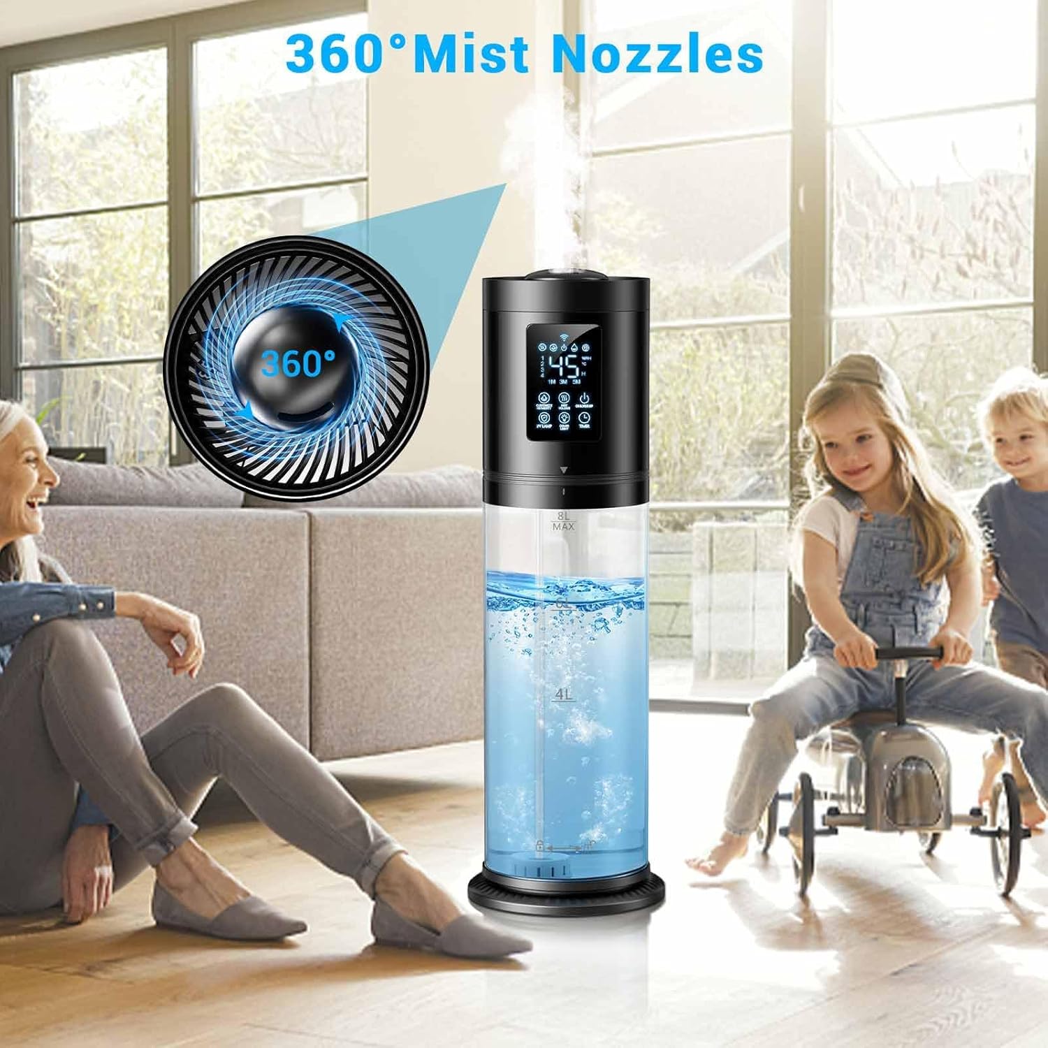 - ă2.1 Gallon Capacity & Powerful Cool Mistă This high-performance cool mist humidifier delivers long-lasting moisture for large rooms, featuring a 2.1 gallon water tank and a powerful ultrasonic mist system. With 4 mist levels and a 360° adjustable nozzle, it ensures even humidity distribution throughout your space while operating quietly for a peaceful environment