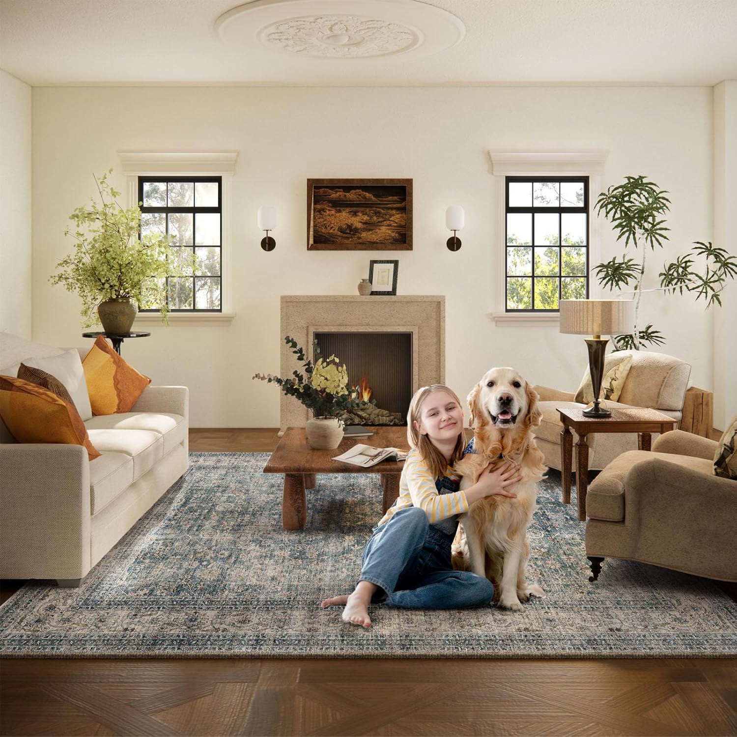 Machine Washable Living Room Rug: 5x7 Area Rugs for Bedroom Vintage Stain Resistant Non Slip Low Pile Lightweight Boho Carpet for Kitchen Dining Room Farmhouse Kids Room Nursery