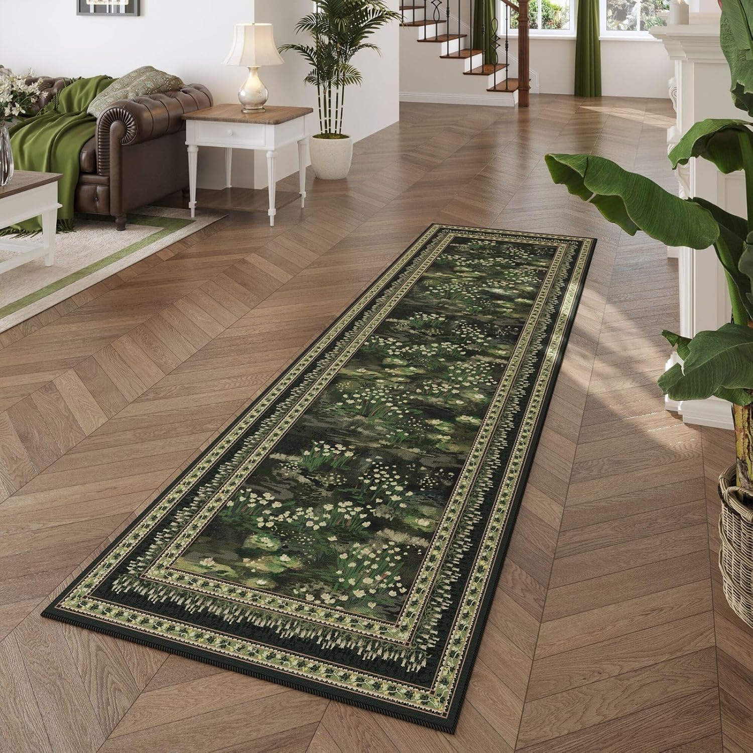 Runner Rug Impressionist-Style Vintage Kitchen Rugs Non Slip Washable Soft Carpet Runner for Kitchen Laundry Bedroom Bathroom, Green