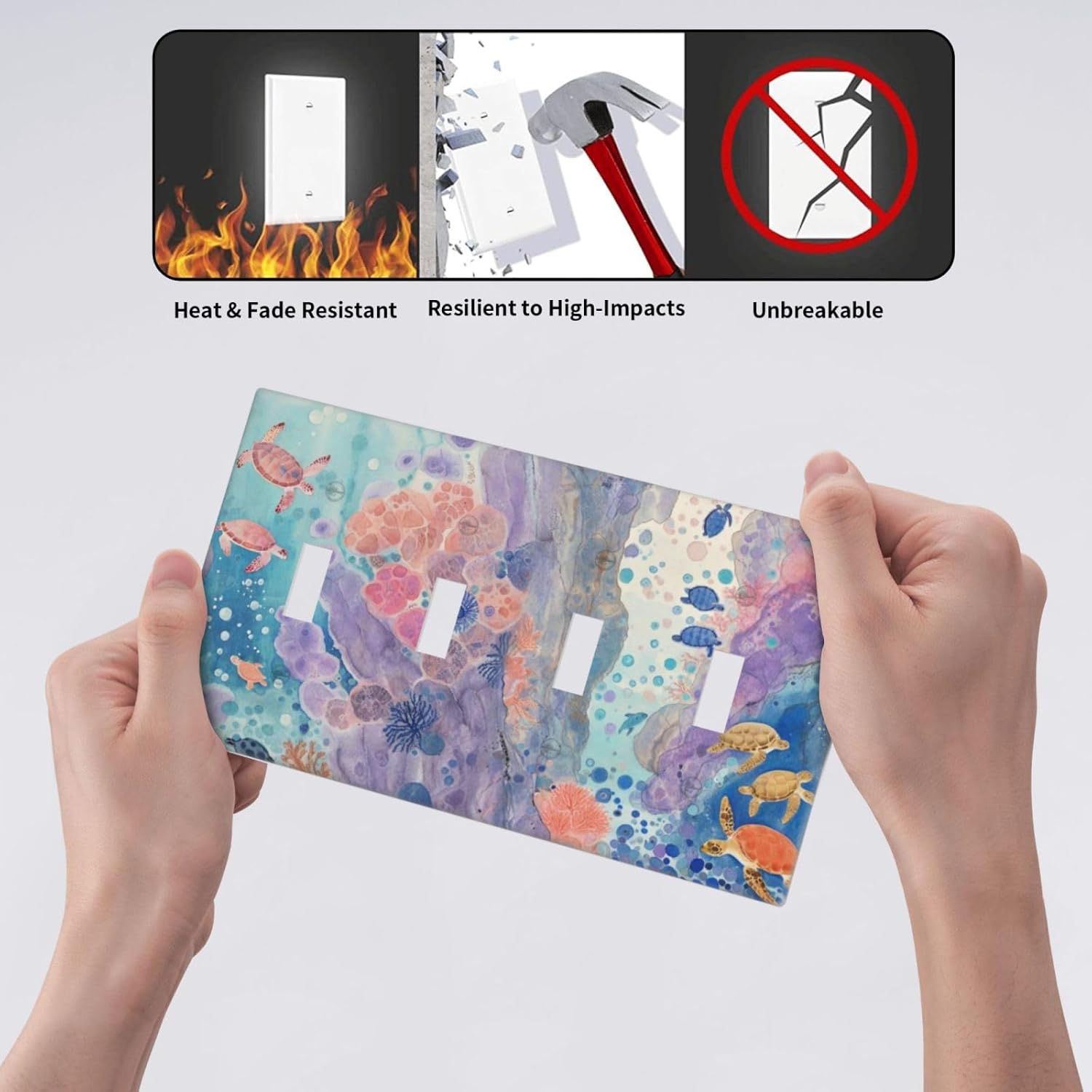 Turtle Coral Fish Watercolor Colorful Underwater World Light Switch Covers Quad Toggle Electrical Faceplate 4 Gang Wall Plate Decorative Switch Plates for Kids Room Home Decor