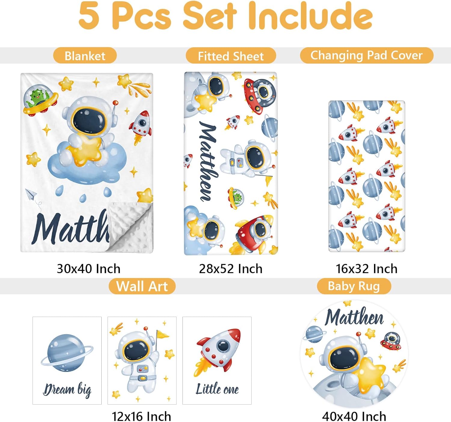 Customized Baby Bedding Set, 5 Pcs Custom Nursery Bedding Set with Baby Name, Double Layer Crib Set for Girls Boys, Personalized Gifts for Toddlers Infants New Parents, Space Astronaut