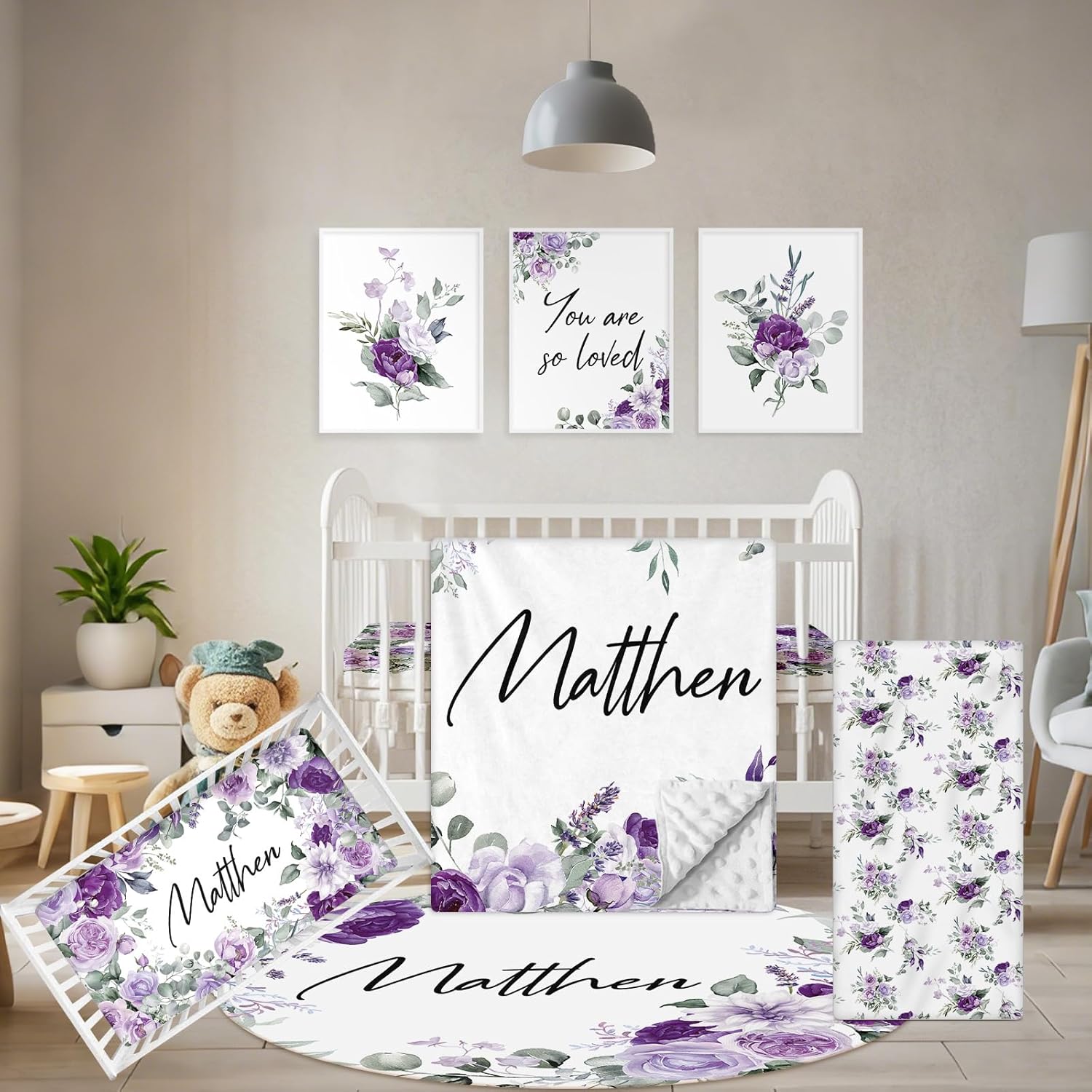 - Complete Set: This customized baby bedding set includes a double layer dotted backing blanket, crib sheet, changing pad cover, baby rug and wall arts, designed to add style and comfort to your nursery. The dotted backing of the double-layer blanket will be adored by your little one.