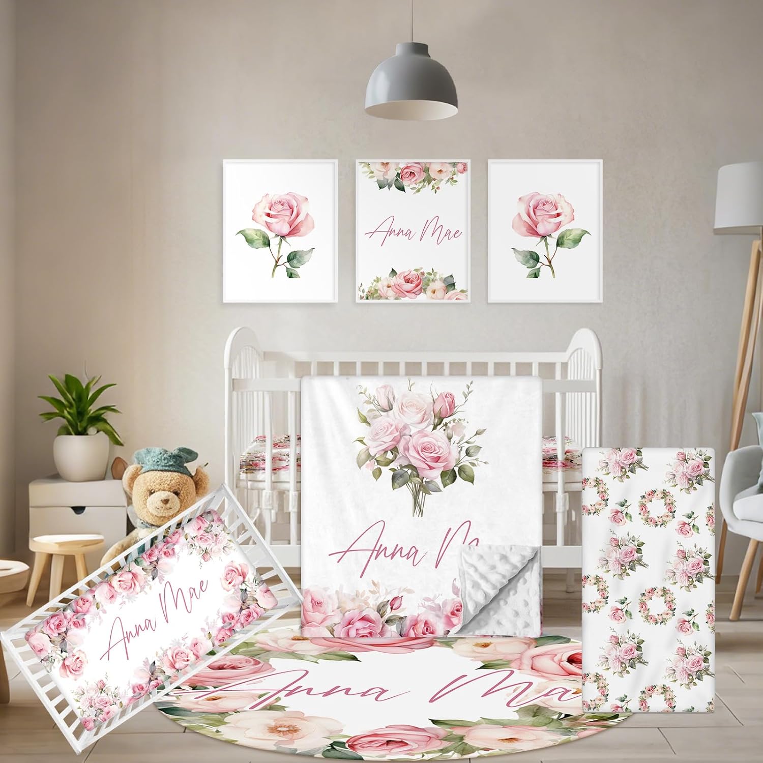 - Complete Set: This customized baby bedding set includes a double layer dotted backing blanket, crib sheet, changing pad cover, baby rug and wall arts, designed to add style and comfort to your nursery. The dotted backing of the double-layer blanket will be adored by your little one.