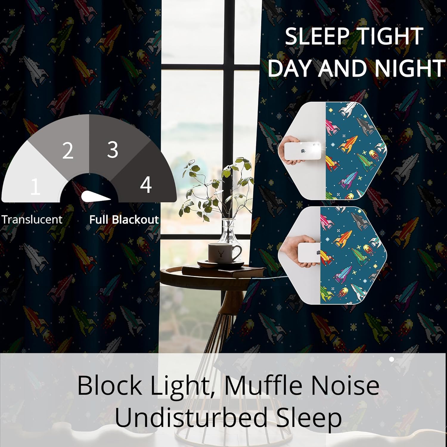 Kids Pixel Rocket Blackout Curtains - 100% Blackout, Thermal Insulated, Noise Reducing, Perfect for Kids Room and Nursery, 2 Panels (Pixel Rocket Fleet, W52×L63)
