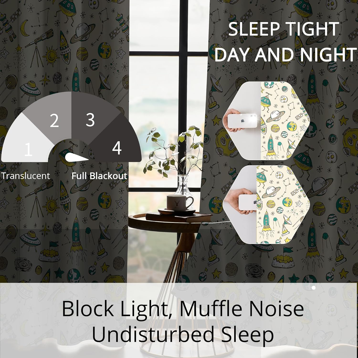 Kids Space UFO and Rocket Blackout Curtains - 100% Blackout, Thermal Insulated, Noise Reducing, Perfect for Kids Room and Nursery, 2 Panels (Space Explorer Sketchbook, W52×L84)