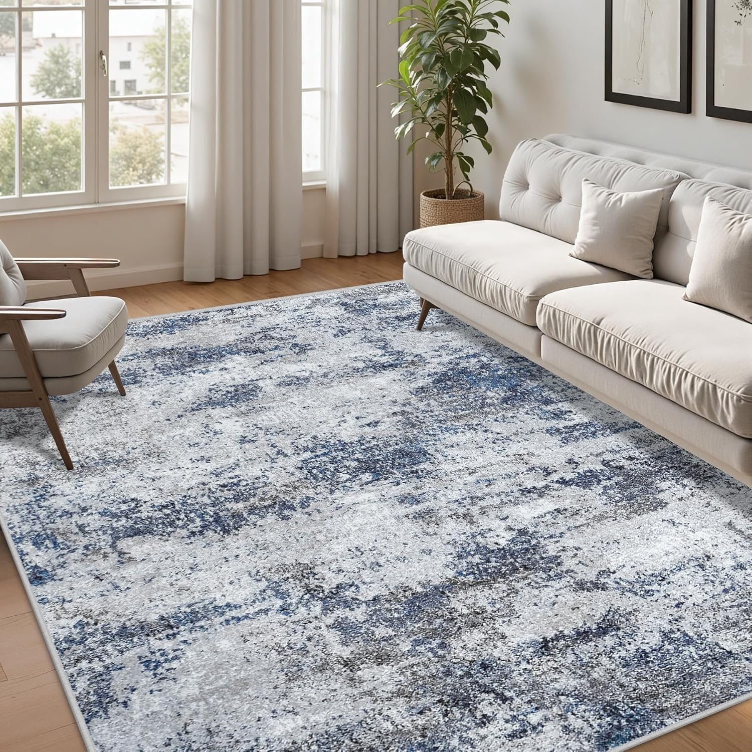 Washable Rug 6x9 Area Rugs: Abstract Washable Rugs with Non-Slip Backing, Stain Resistant Indoor Floor Carpet for Bedroom Dining Room Table Nursery Hallway Home Office Blue/Gray/Black
