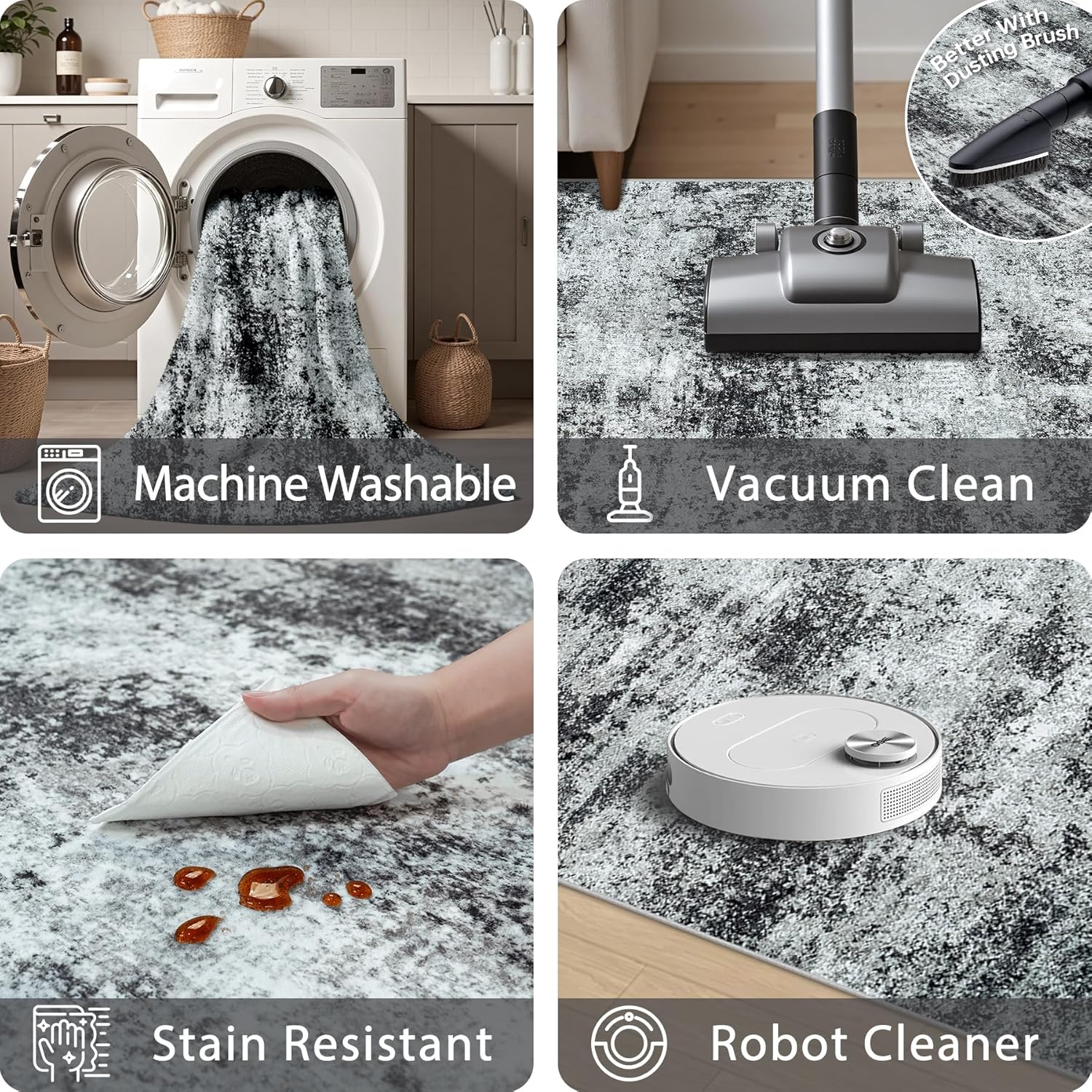 Area Rug 9x12 Washable Rugs: Abstract Large Living Room Rugs with Non-Slip Backing, Stain Resistant Indoor Floor Carpet for Bedroom Dining Room Table Nursery Hallway Home Office Dark Black/Gray