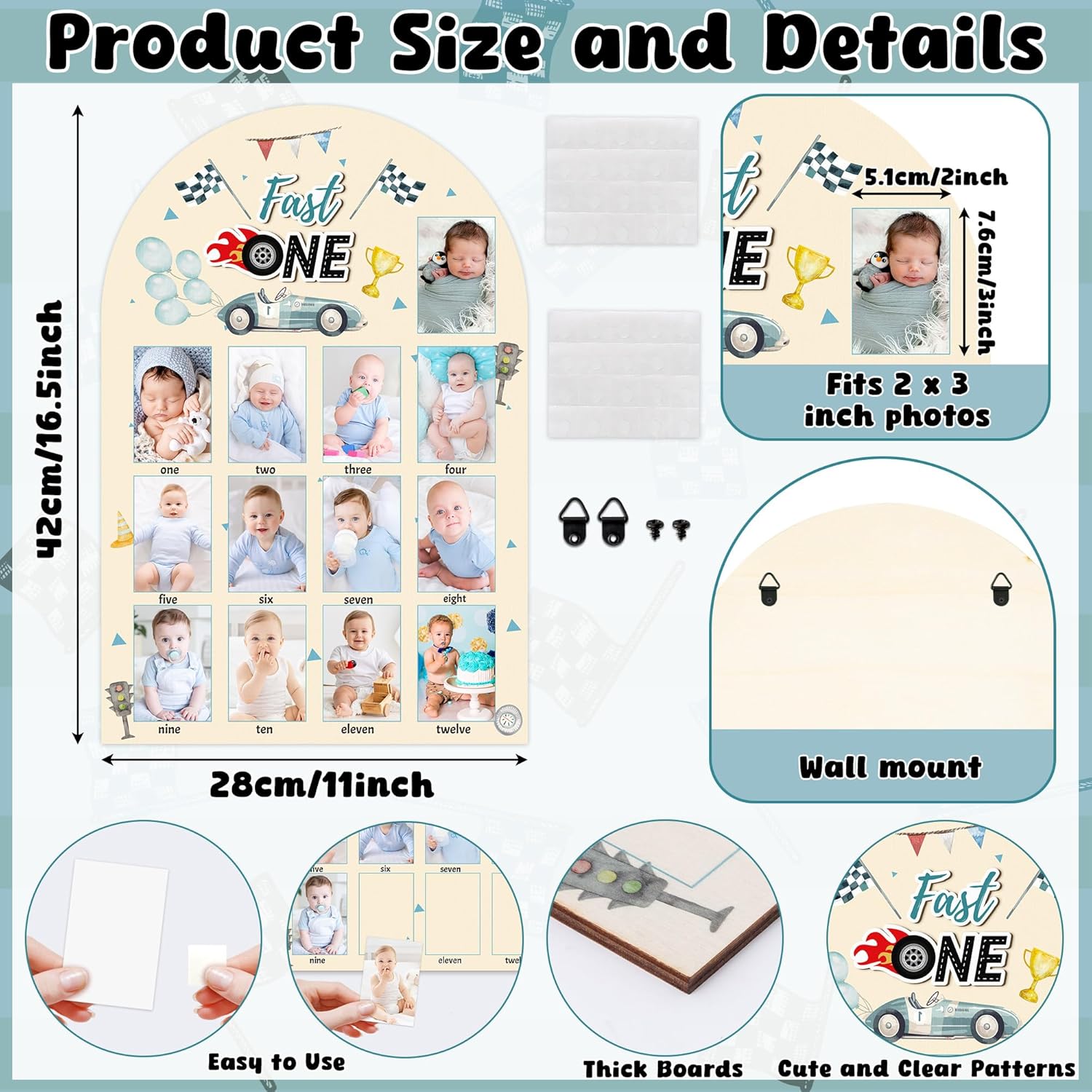 - First-Year Picture Display: Our race car themed wooden photo board is good for capturing baby's first year growth, which is measuring approximately 11 × 16.5 inches, with 12 spots for 3 × 2 inch photos. This fast one birthday decoration creates a joyful visual timeline of your baby boy's special moments. Display it in the nursery or at a baby shower, making every memory last a lifetime.