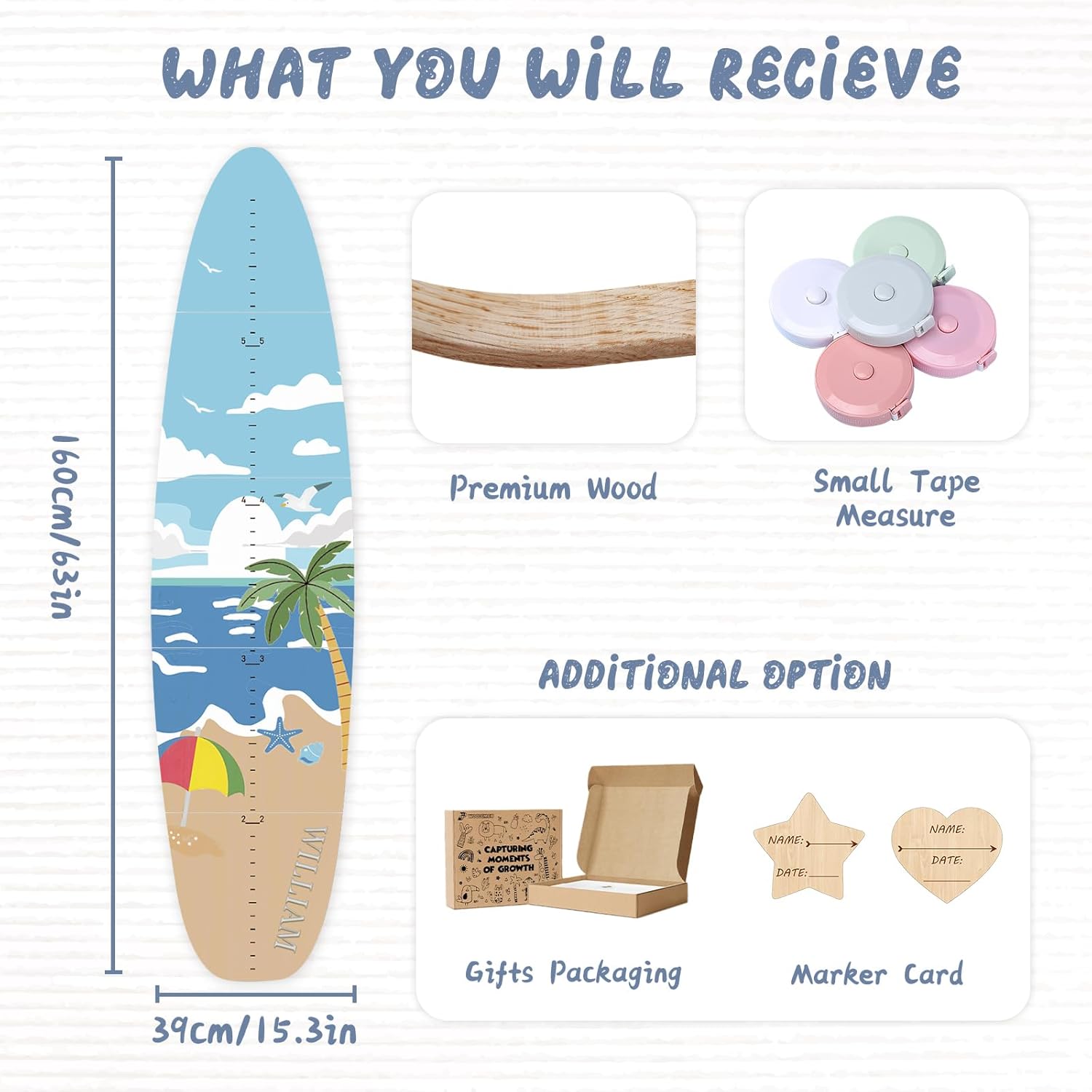 Personalized Name Growth Chart, Surfboard Children's Height Growth Chart Wall Board, Stereoscopic Height Ruler, Precision Height Measuring Instrument for Nursery Room, Includes Tools