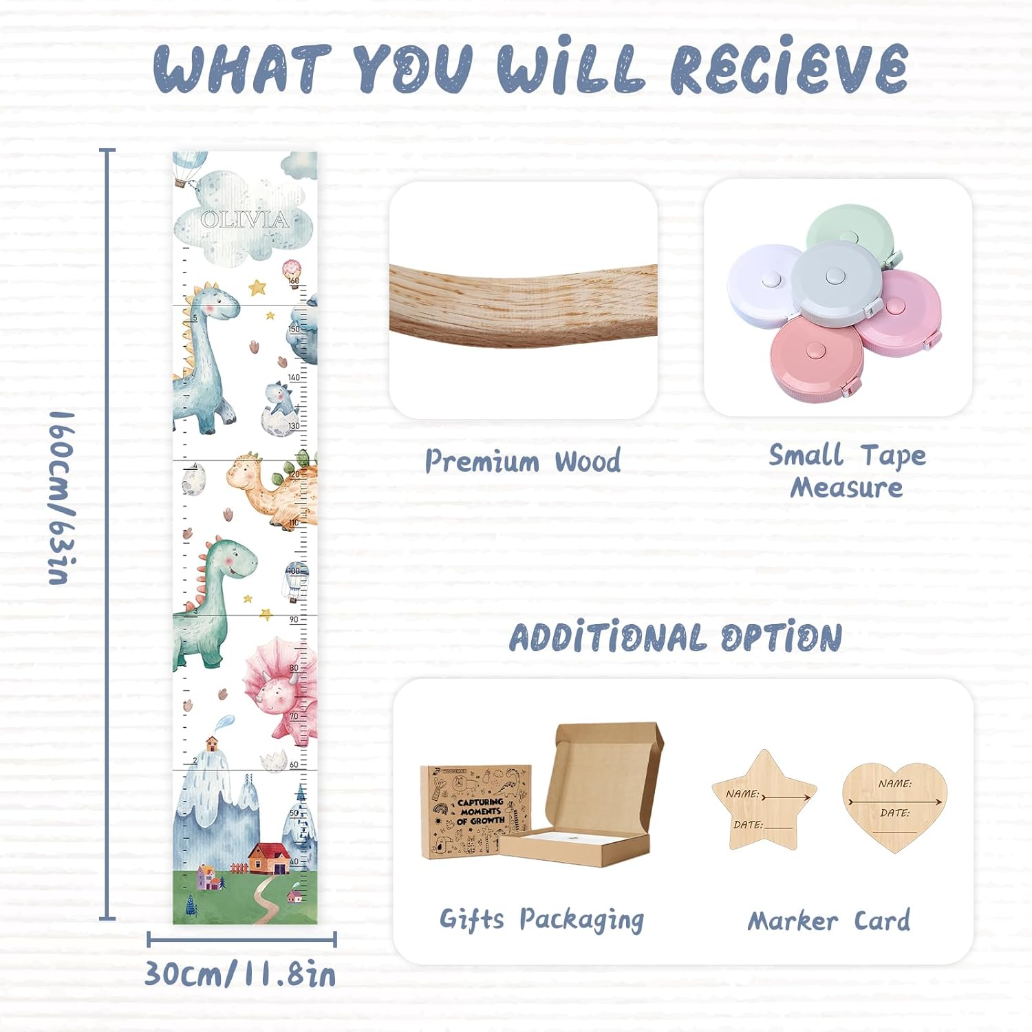 Personalized Name Growth Chart for Kids, Watercolor Dinosaur Height Measurement Chart for Children's Growth, Suitable for Both Boys and Girls, Removable and Easy to Store, Lightweight