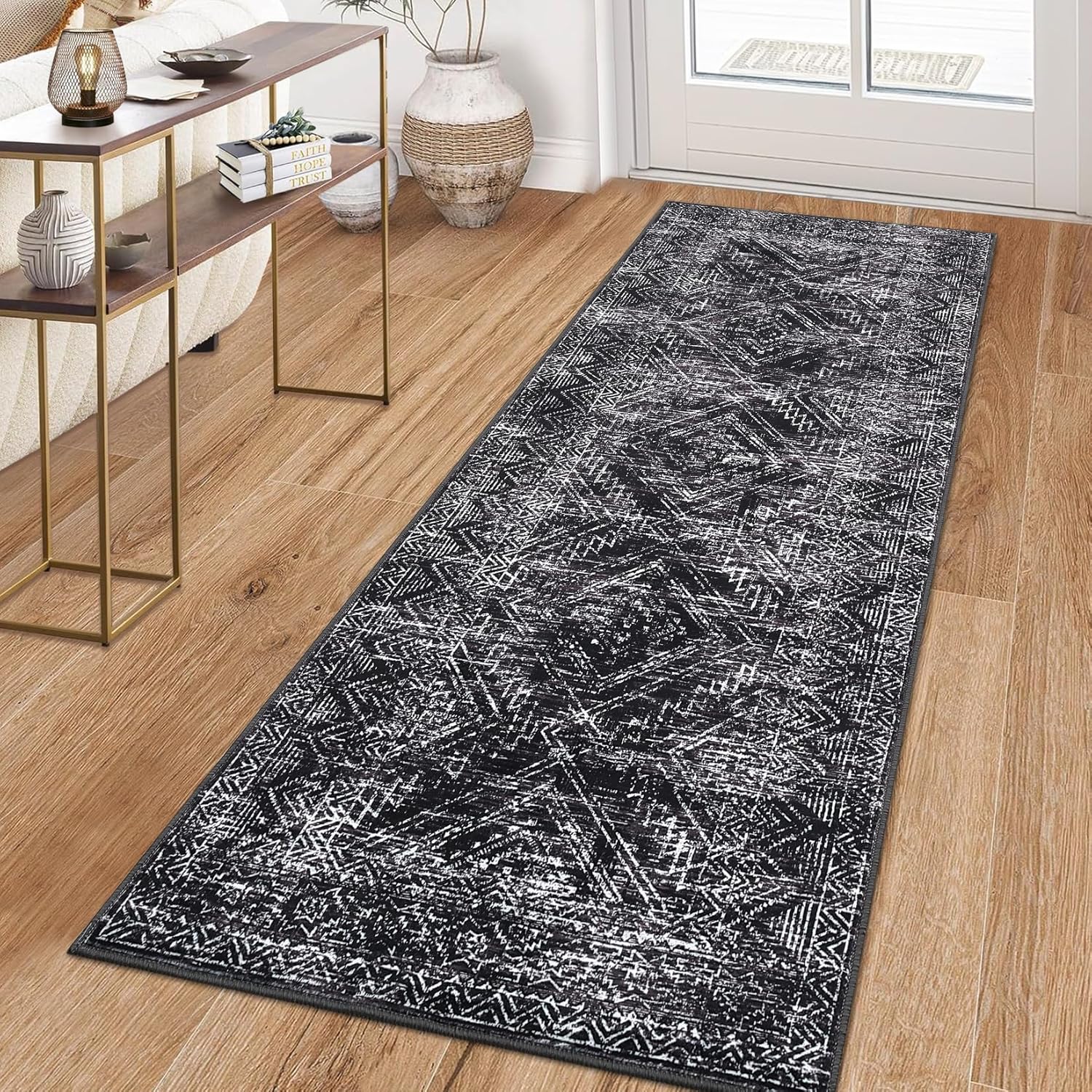 COZYLOOM Rug Runners 2x8 Washable for Hallway Vintage Non Slip Area Rug Geometric Soft Throw Rugs Low Pile Stain Resistant Carpet for Office Dining Room Living Room, Black
