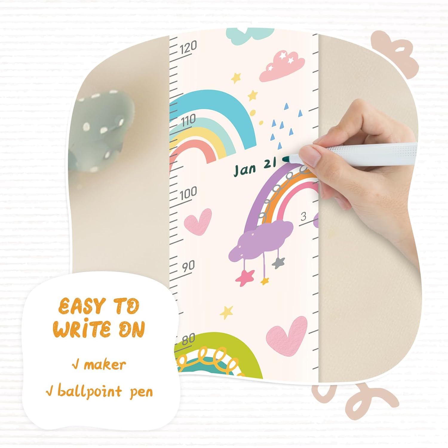 - Design: Kids growth chart with rope at the top of the chart, easy to install and removeable, foldable and portable design, easy to store, hang, roll up, transport, and save space. It boasts a material that's easy to write on, where you can use dark colored ballpoint pens and markers to track growth milestones.